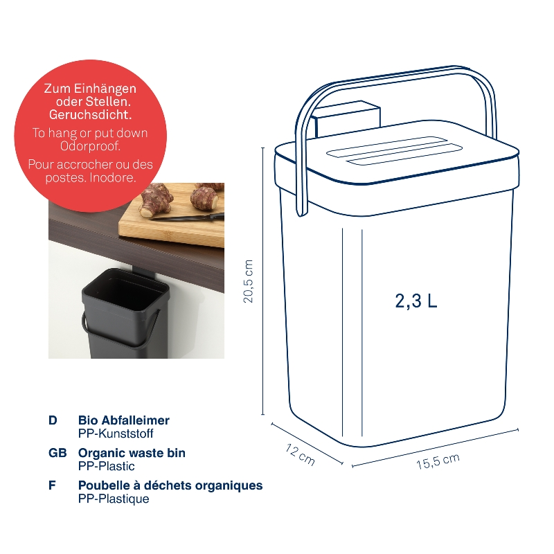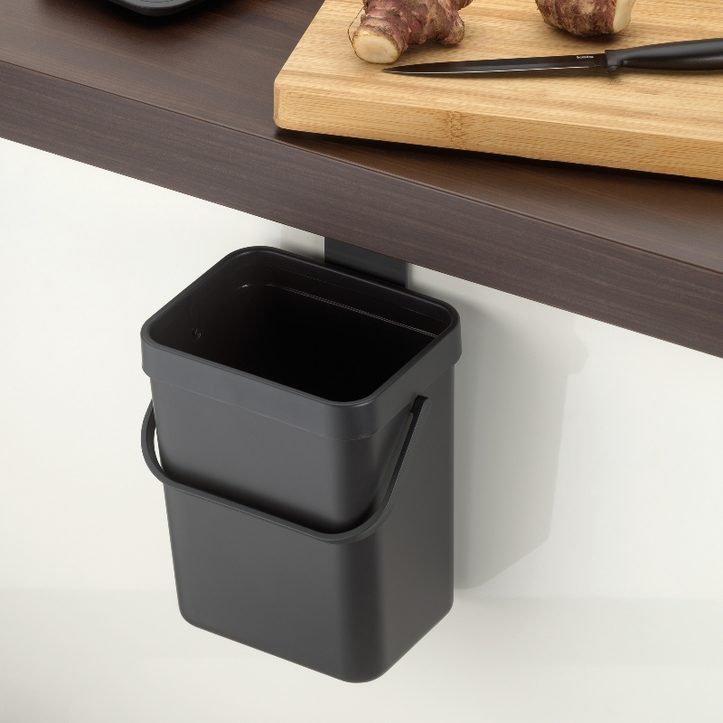 Легке та функціональне відро KELA Paulo швидко підвішується на дверцятах кухонної шафки для зручного збирання відходів.