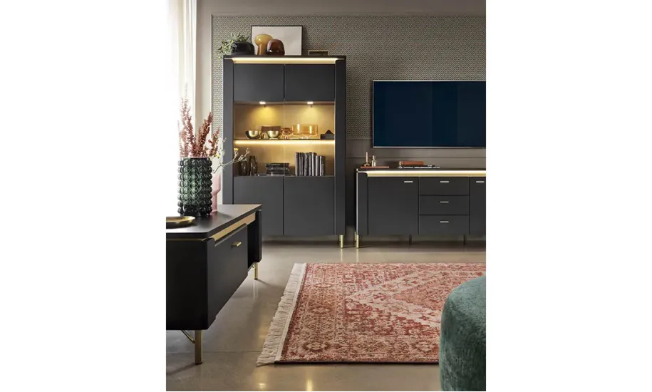 Дводверна вітрина Norica — це ідеальний елемент для створення стильного та елегантного інтер'єру вітальні чи їдальні. Витончене поєднання чорного матового та золотого кольорів, разом з частково заскленими фасадами з загартованого скла, надає меблям розкішного вигляду. Вітрина обладнана сучасними металевими ручками золотистого відтінку та високими металевими ніжками, що підкреслюють її елегантність. Вбудоване світлодіодне підсвічування створює приємну атмосферу, а можливість додаткового освітлення дає можливість налаштувати світлову композицію за вашим бажанням.