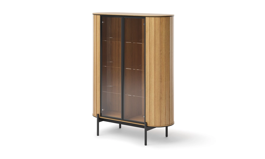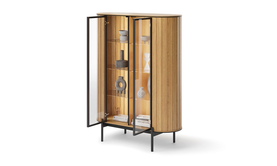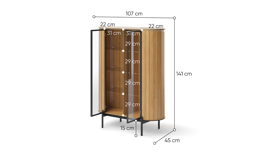 - Візуальну легкість моделі підкреслюють високі чорні металеві ніжки, які не лише додають стилю, а й роблять вітрину зручною в повсякденному використанні: під нею легко прибрати, навіть роботом-пилососом.