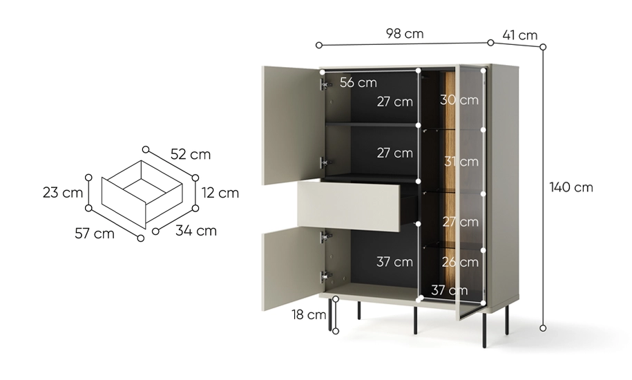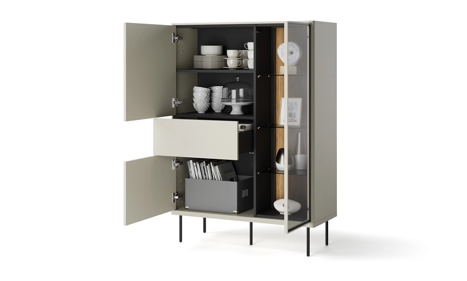 - Модель обладнана двома дверцятами, однією вітриною та шухлядою, що відкривається легким натисканням. Це зручно у щоденному використанні та підкреслює загальну мінімалістичну концепцію. Усередині — сім містких поличок, які дозволяють зберігати посуд, книги, сувеніри або декоративні елементи у впорядкованому вигляді.