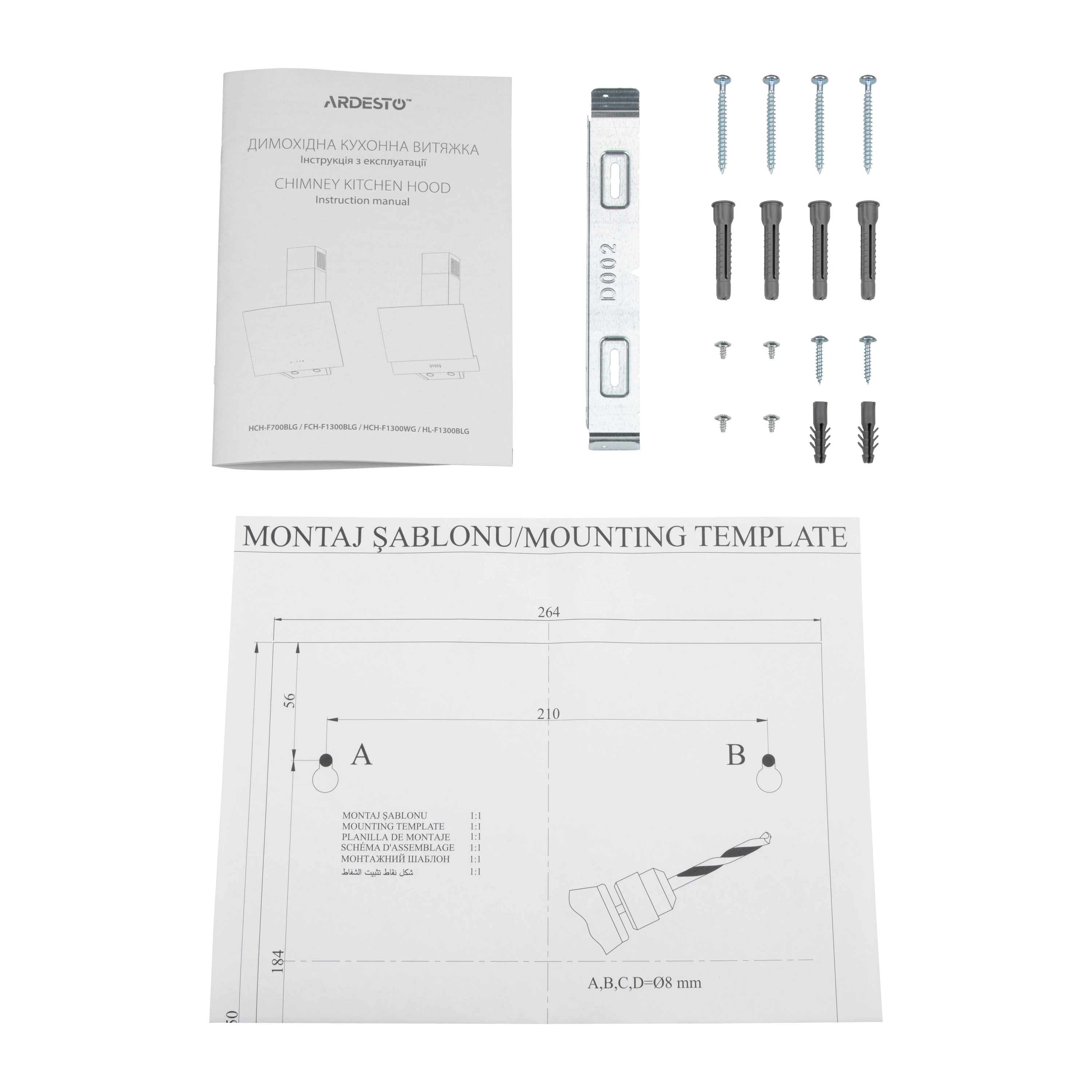 - Комплектація кухонна витяжка; інструкція; монтажний комплект; кабель живлення з вилкою європейського зразка довжи