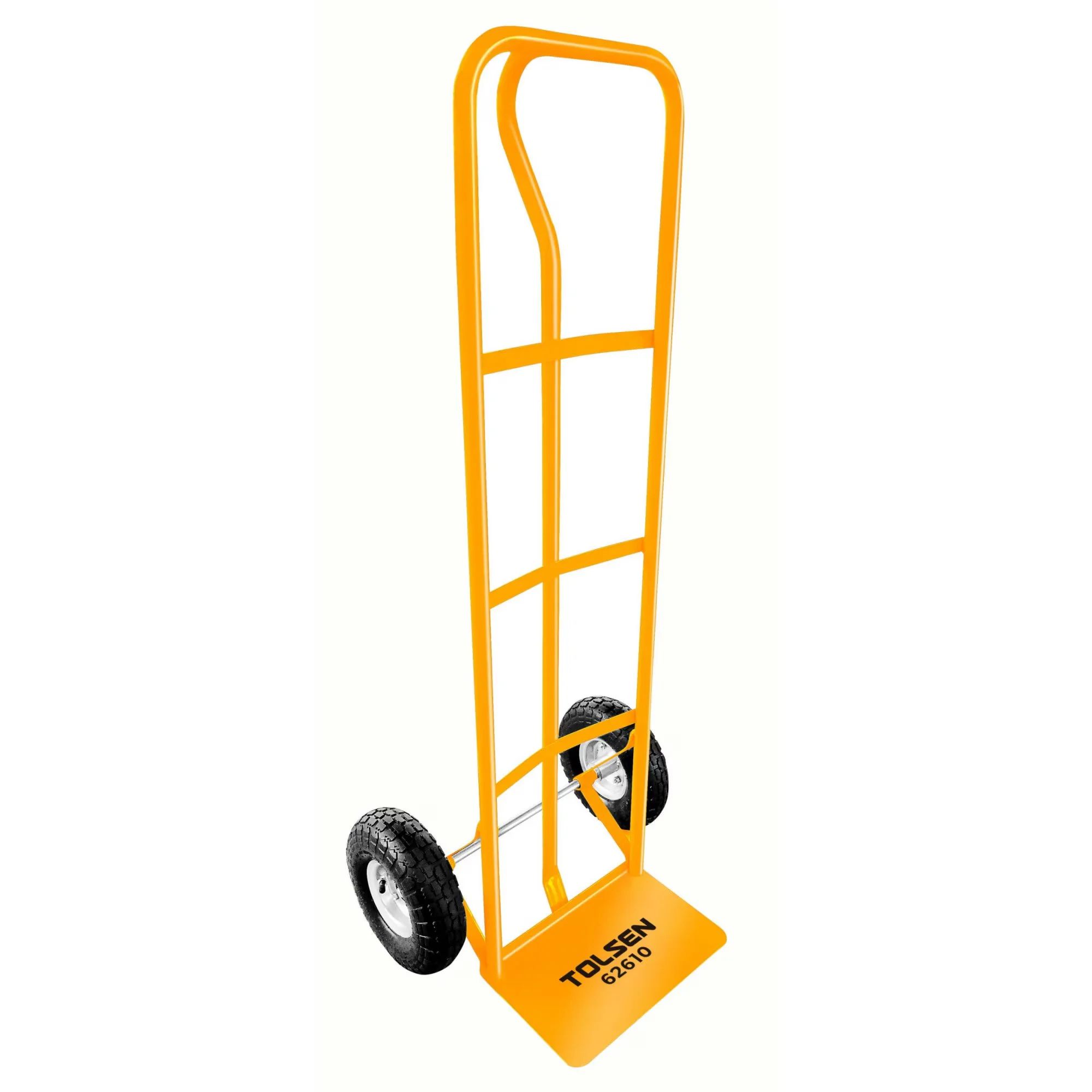 Універсальний вантажний візок Tolsen із вантажопідйомністю до 200 кг оснащений платформою 35 × 22,5 см (товщина 3,5 мм) та пневматичними колесами 10" × 3,50-4 для плавного руху на нерівних поверхнях. Рама з трубчастої сталі забезпечує міцність і довговічність. Габарити візка: 1310 × 550 × 460 мм. Ідеально підходить для транспортування вантажів удома, на складі або будівництві.
