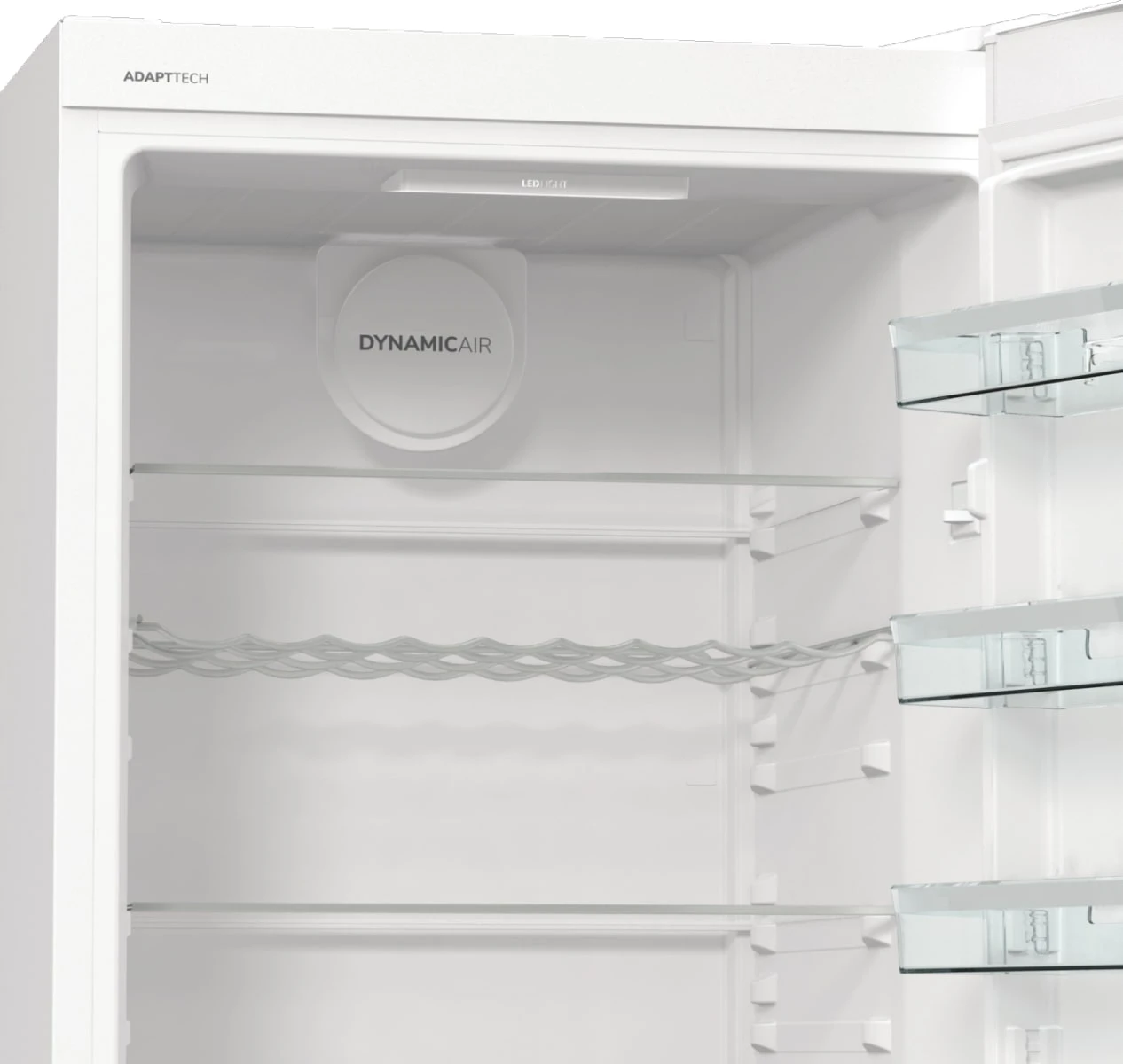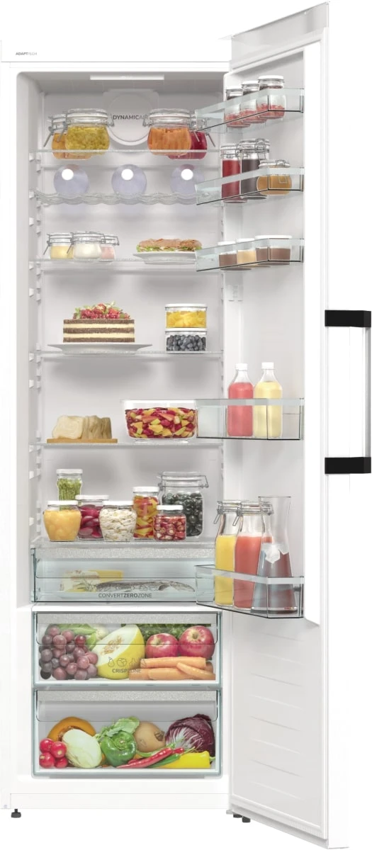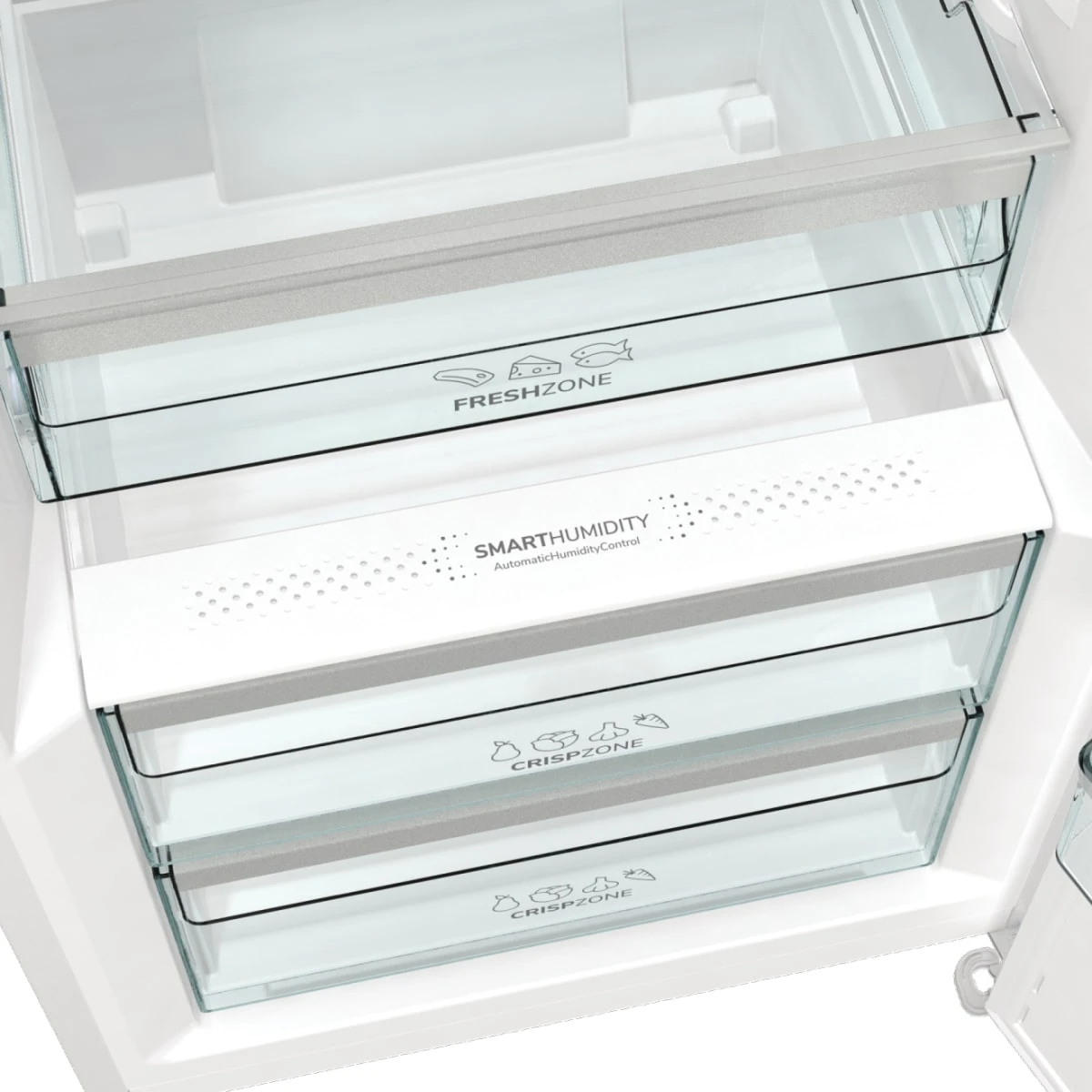 Холодильна камера Gorenje створена для зберігання продуктів у просторому внутрішньому об’ємі з продуманою організацією полиць і зон. Система AdaptTech стабілізує температуру під час частого відкривання дверцят, зменшуючи коливання всередині камери. Рівномірне охолодження забезпечується вентиляцією DynamicAir, а контейнер CrispZone з SmartHumidity автоматично контролює вологість для овочів і фруктів. Для м’яса, риби та сирів передбачено окрему шухляду FreshZone зі зниженою температурою.