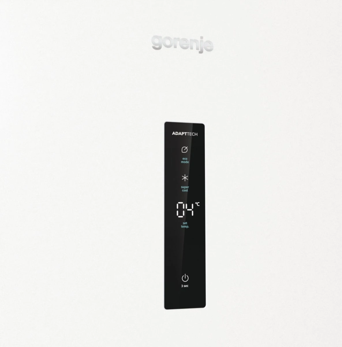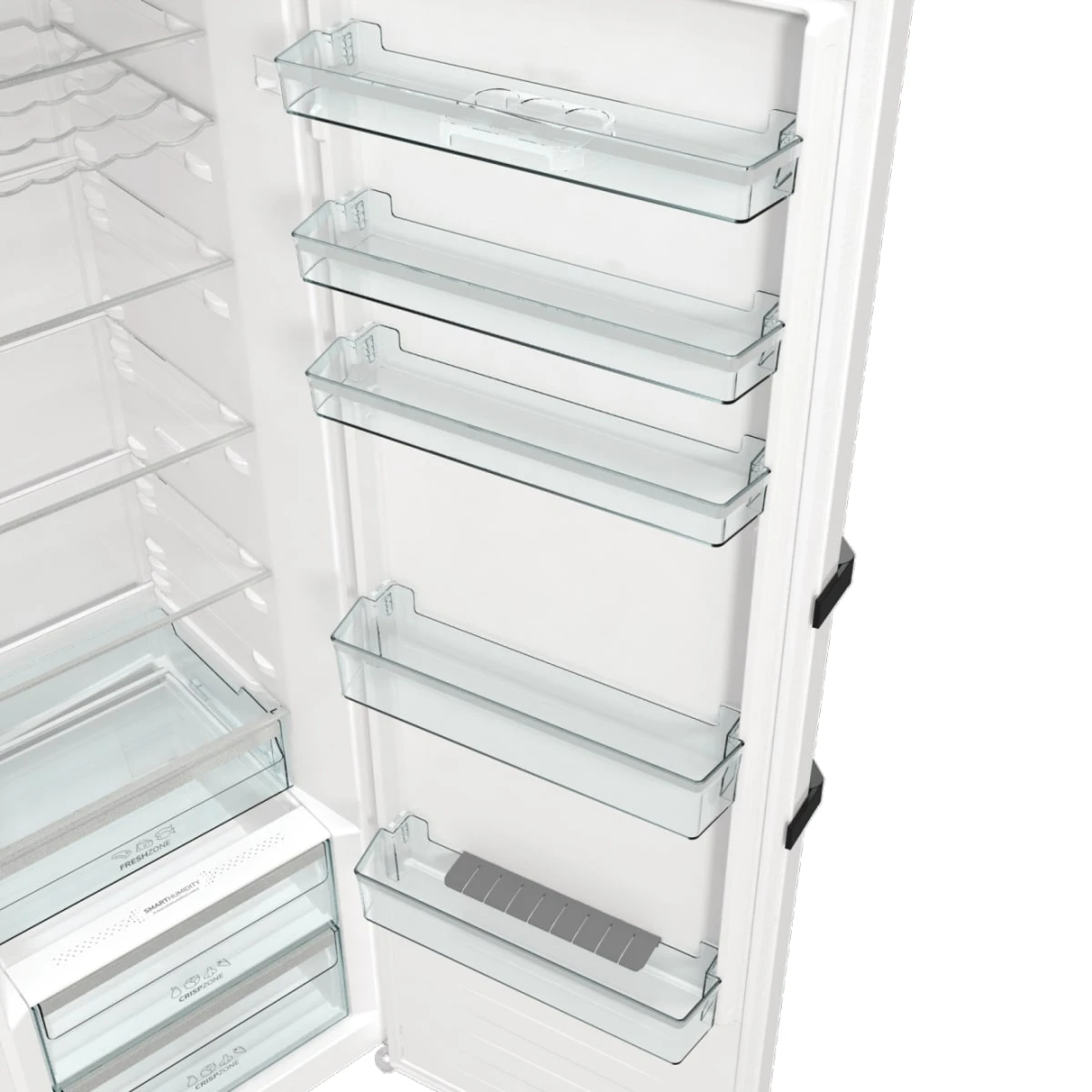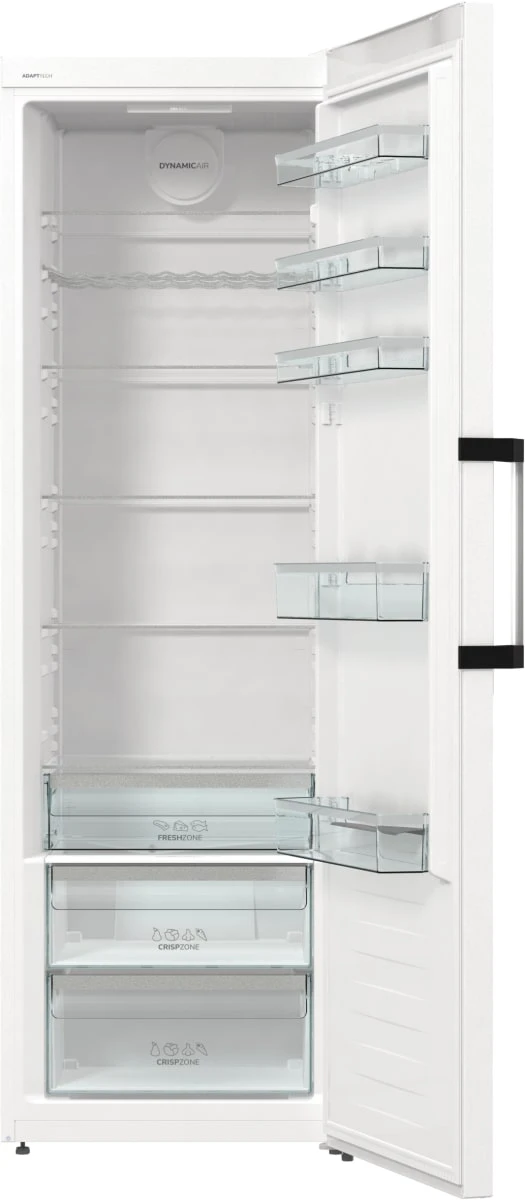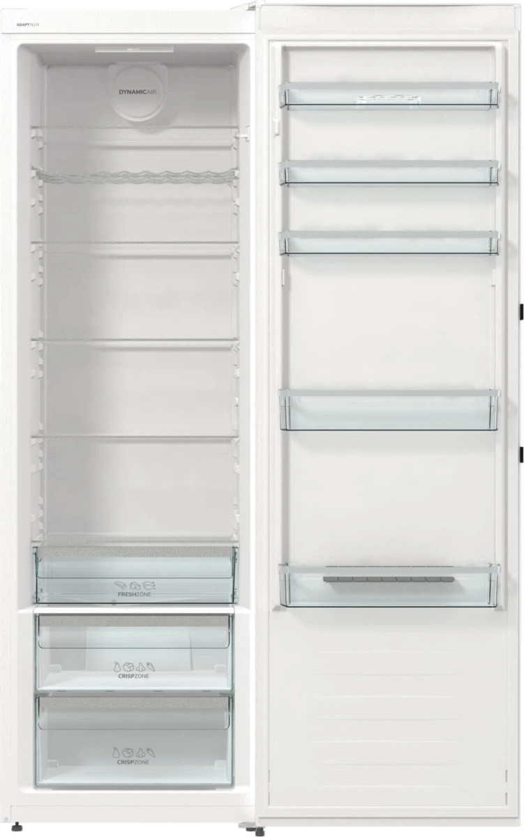 Холодильна камера Gorenje створена для зберігання продуктів у просторому внутрішньому об’ємі з продуманою організацією полиць і зон. Система AdaptTech стабілізує температуру під час частого відкривання дверцят, зменшуючи коливання всередині камери. Рівномірне охолодження забезпечується вентиляцією DynamicAir, а контейнер CrispZone з SmartHumidity автоматично контролює вологість для овочів і фруктів. Для м’яса, риби та сирів передбачено окрему шухляду FreshZone зі зниженою температурою.