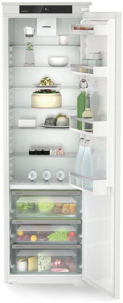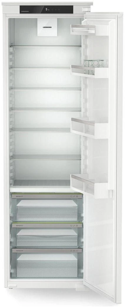 Вбудований однокамерний холодильник Liebherr IRBSD 5120 пропонує корисний об'єм 291 л, з яких 96 л припадає на зону BioFresh з трьома контейнерами. Пристрій оснащений сенсорним керуванням за дверима, автоматичним розморожуванням, динамічною системою охолодження та світлодіодним стельовим освітленням. Зона BioFresh підтримує оптимальну вологість і температуру для тривалого зберігання свіжих продуктів. Рівень шуму становить 35 дБ, річне споживання енергії — 120 кВт·год (клас D). Двері праві з можливістю перенавішування, гарантія — 3 роки.