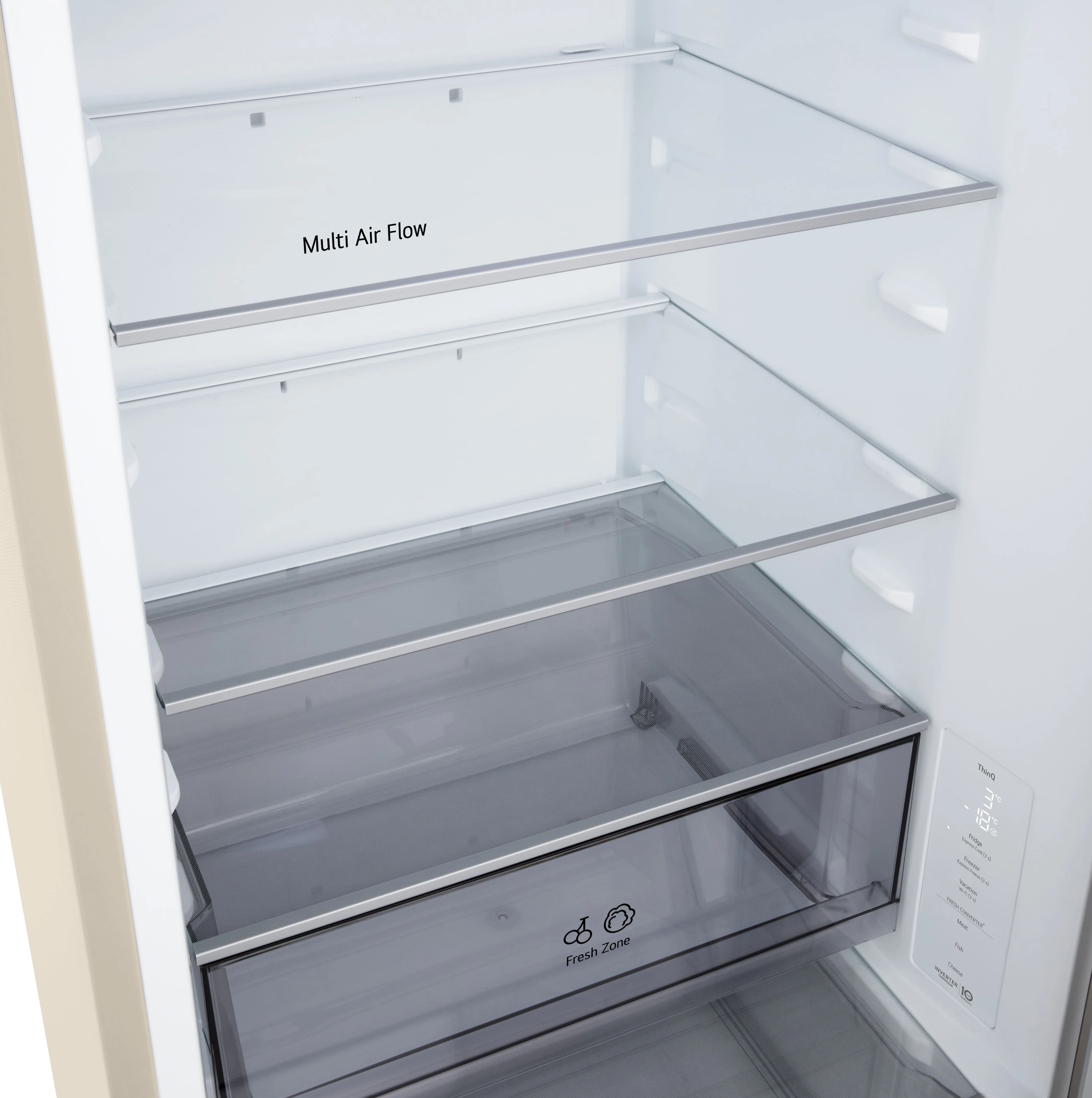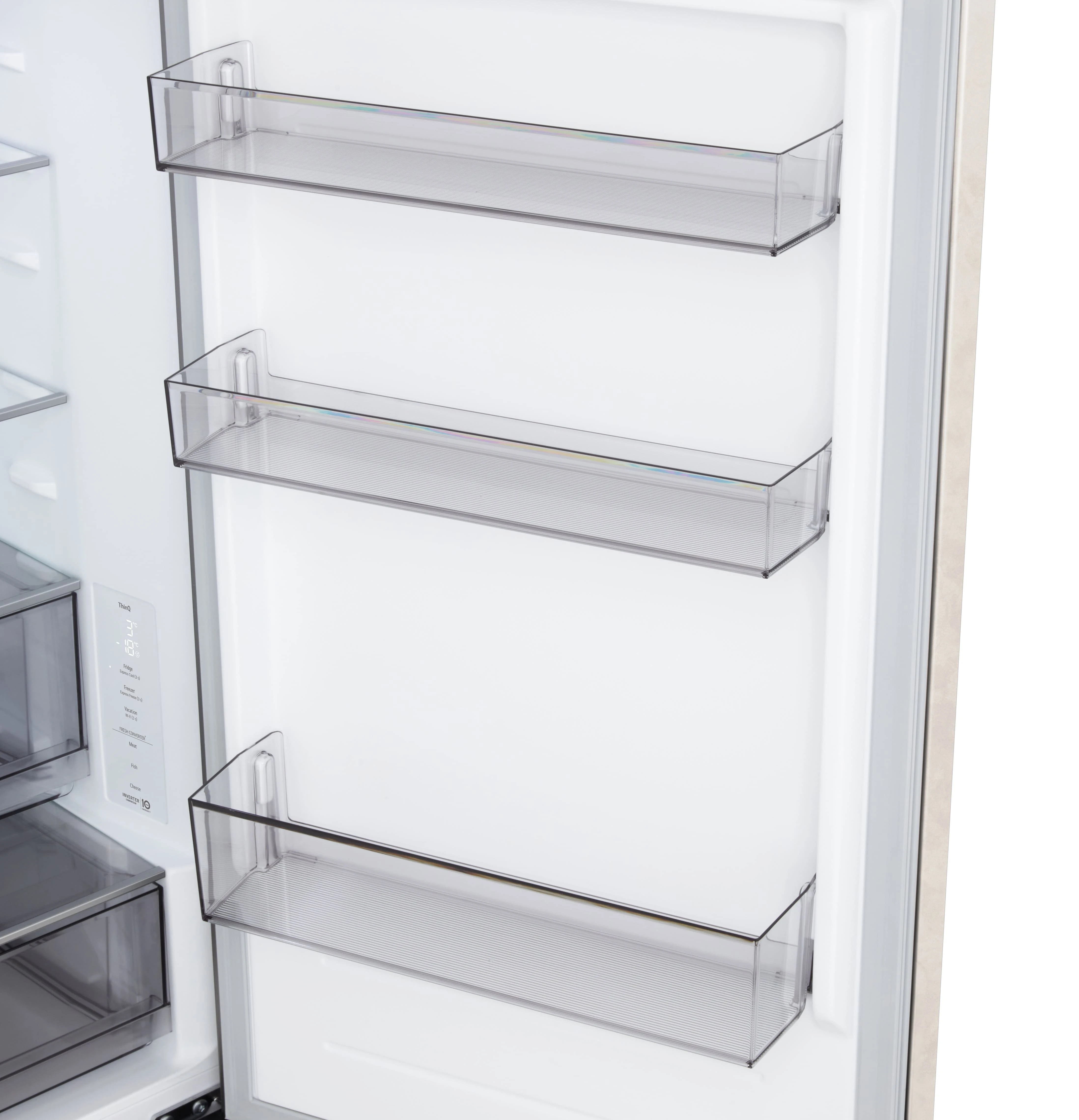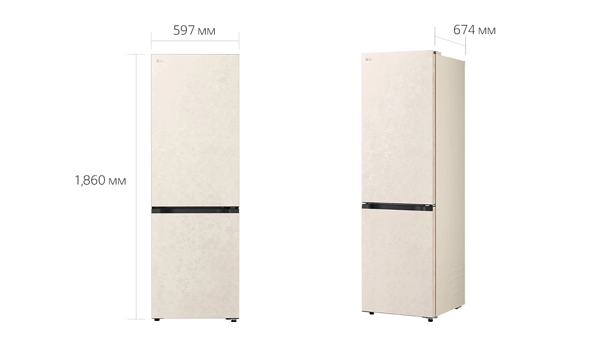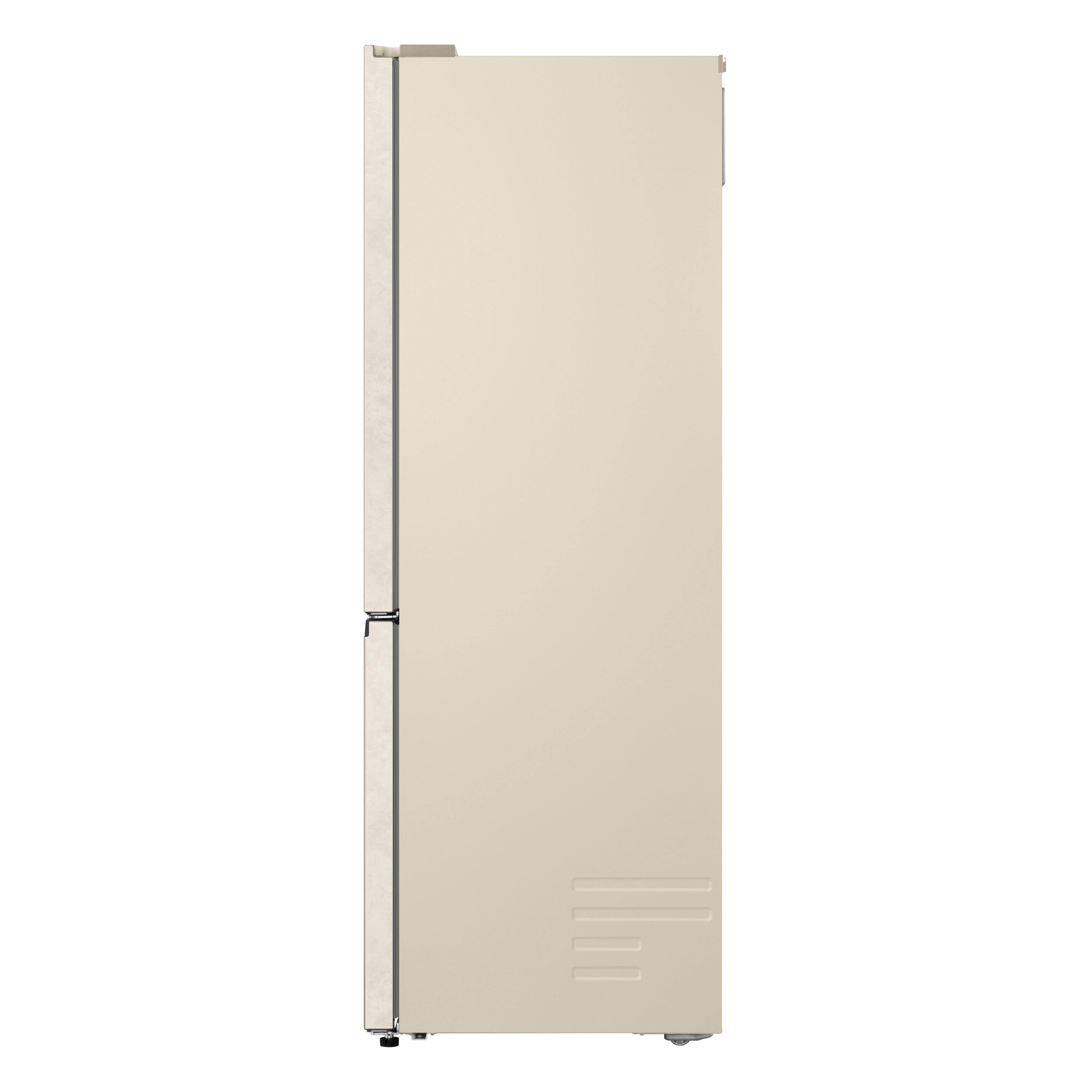 Холодильник LG GC-B459EEYM з нижньою морозильною камерою забезпечує загальний об’єм 333 літри, розділений на 220 літрів для свіжих продуктів і 113 літрів для заморожених. Total No Frost разом із Multi Air Flow рівномірно розподіляє холод, усуваючи іній і підтримуючи стабільну температуру. Інверторний компресор працює на рівні 35 дБ, а клас E гарантує помірне енергоспоживання 253 кВт·год на рік. DoorCooling+ швидко охолоджує дверні полиці, а ThinQ з Wi-Fi дозволяє відстежувати стан через додаток. Внутрішній дисплей і зона свіжості Fresh Zone доповнюють практичність для щоденного використання.