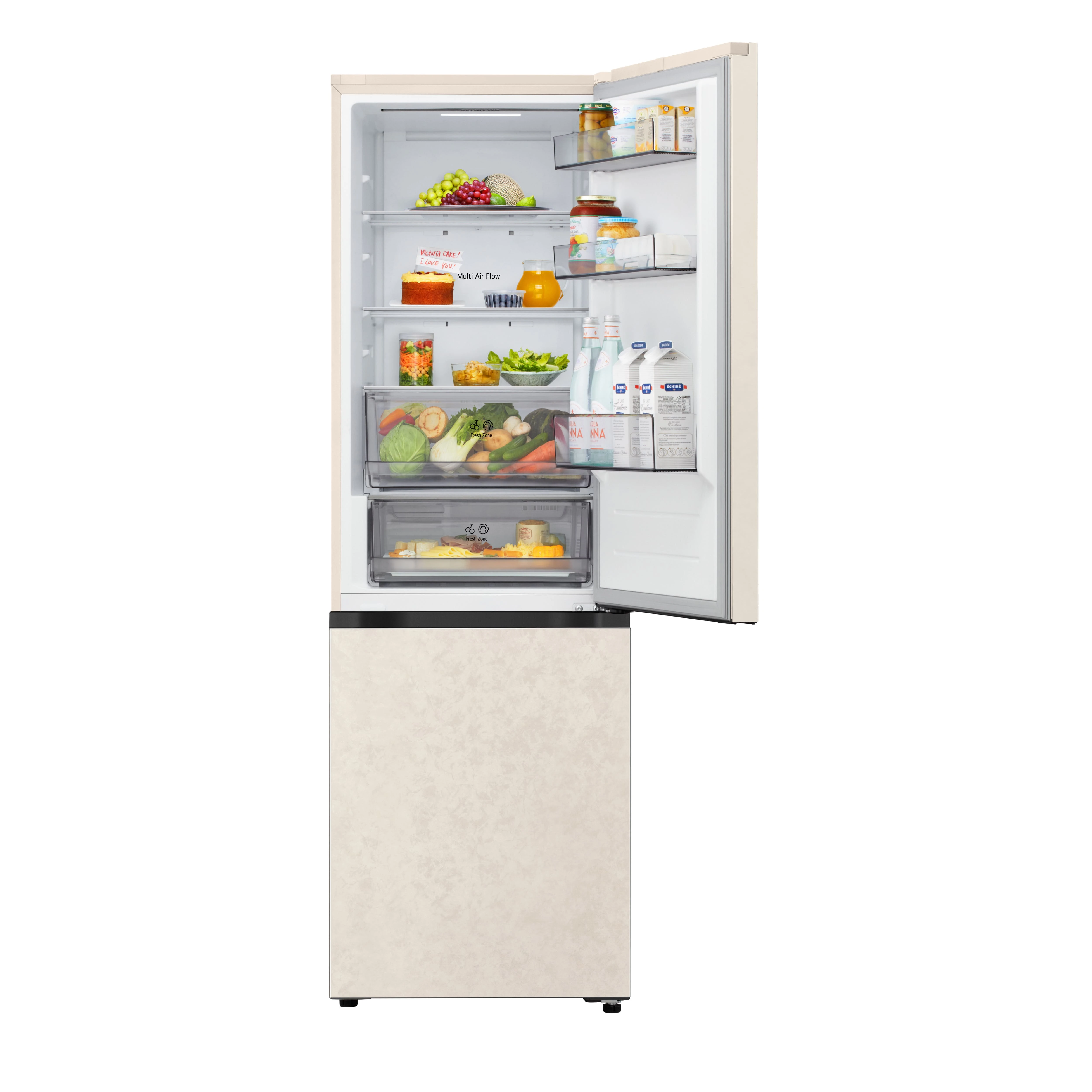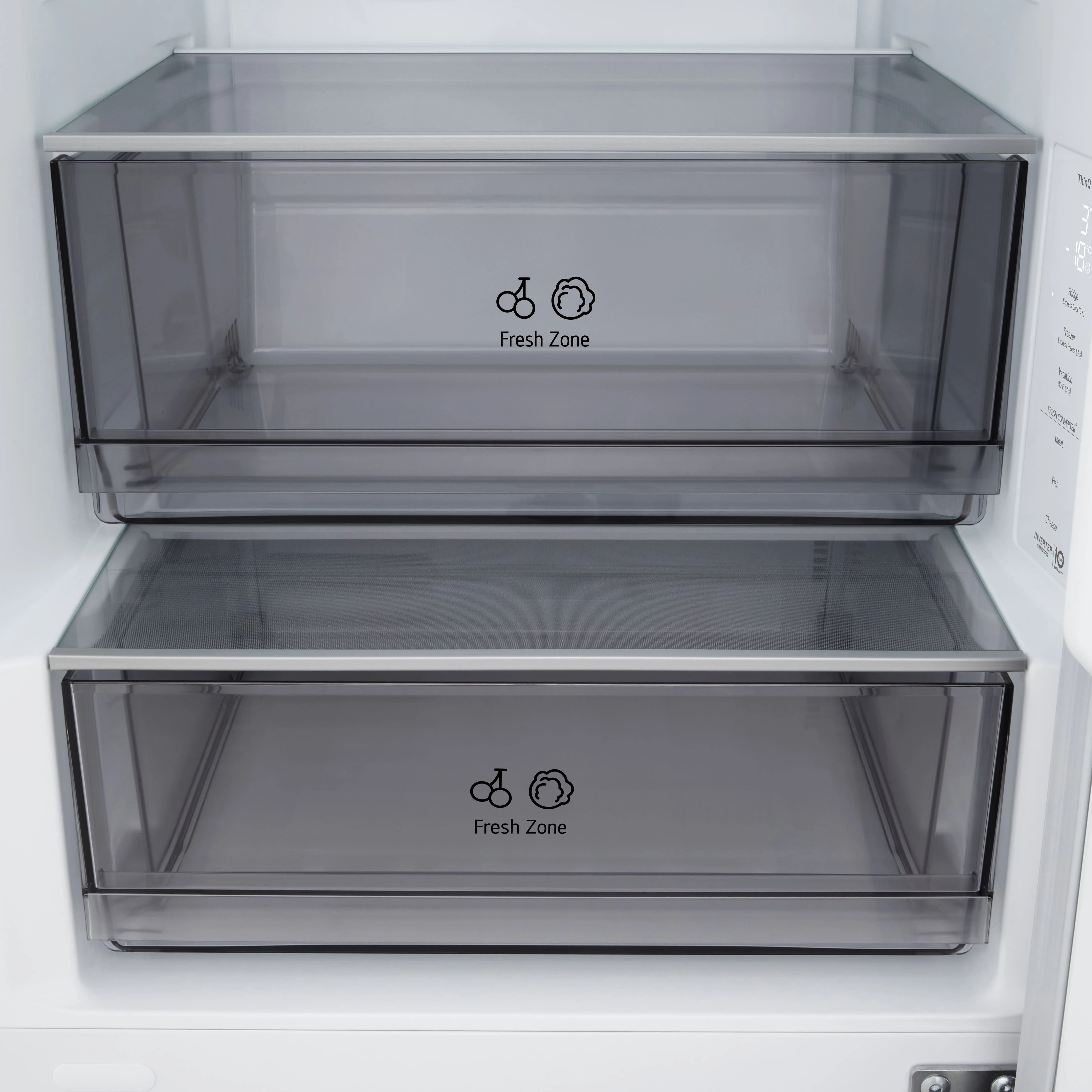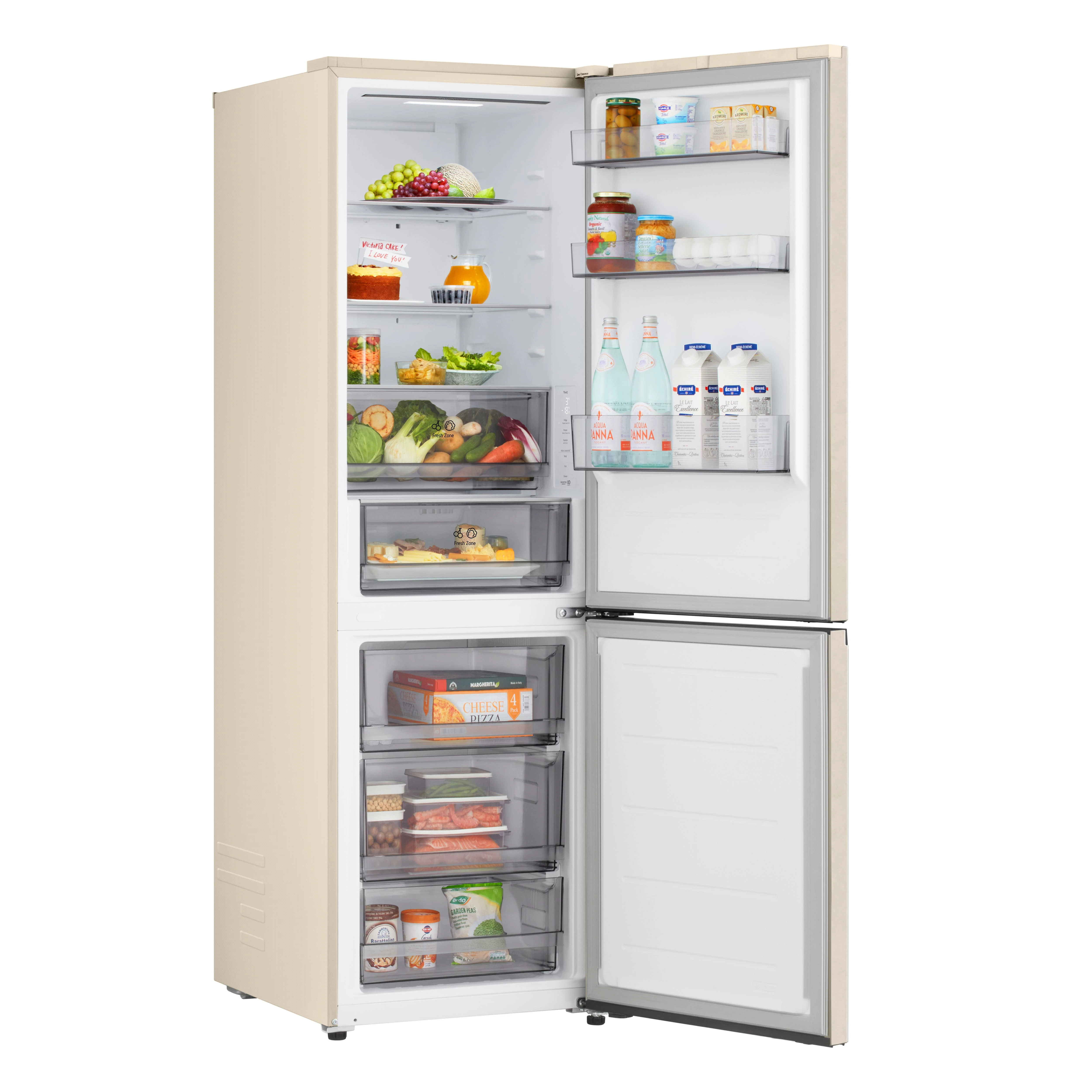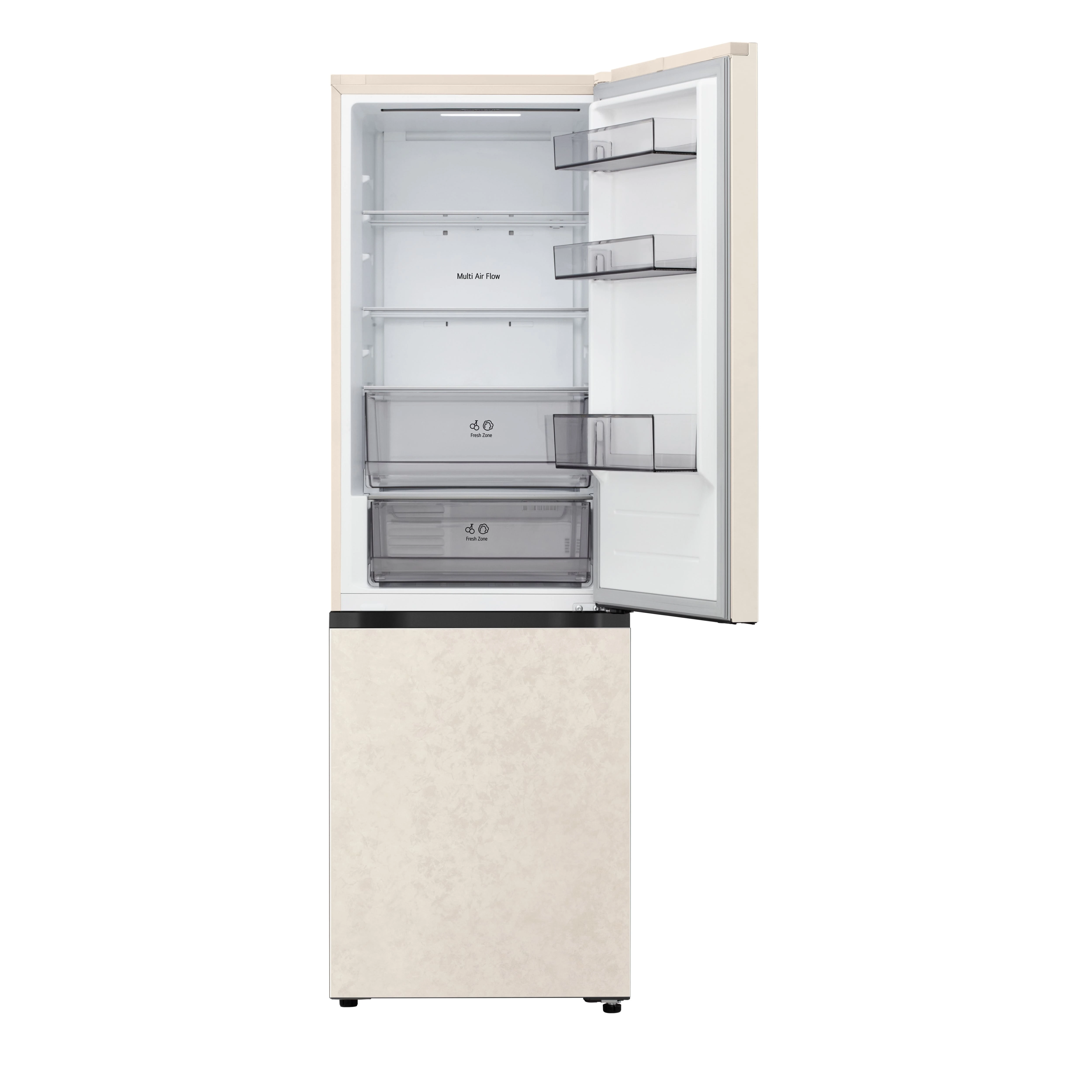 Холодильник LG GC-B459EEYM з нижньою морозильною камерою забезпечує загальний об’єм 333 літри, розділений на 220 літрів для свіжих продуктів і 113 літрів для заморожених. Total No Frost разом із Multi Air Flow рівномірно розподіляє холод, усуваючи іній і підтримуючи стабільну температуру. Інверторний компресор працює на рівні 35 дБ, а клас E гарантує помірне енергоспоживання 253 кВт·год на рік. DoorCooling+ швидко охолоджує дверні полиці, а ThinQ з Wi-Fi дозволяє відстежувати стан через додаток. Внутрішній дисплей і зона свіжості Fresh Zone доповнюють практичність для щоденного використання.