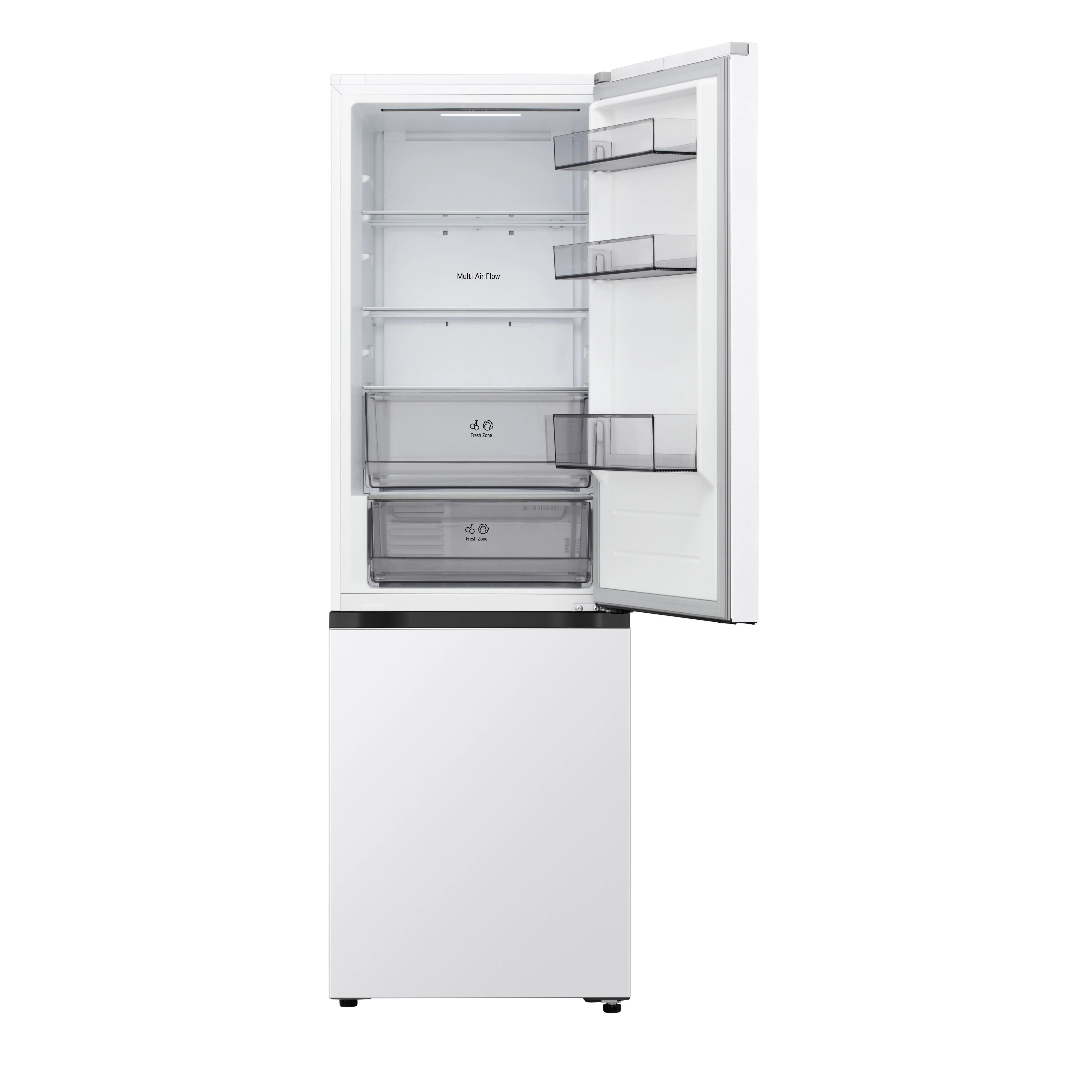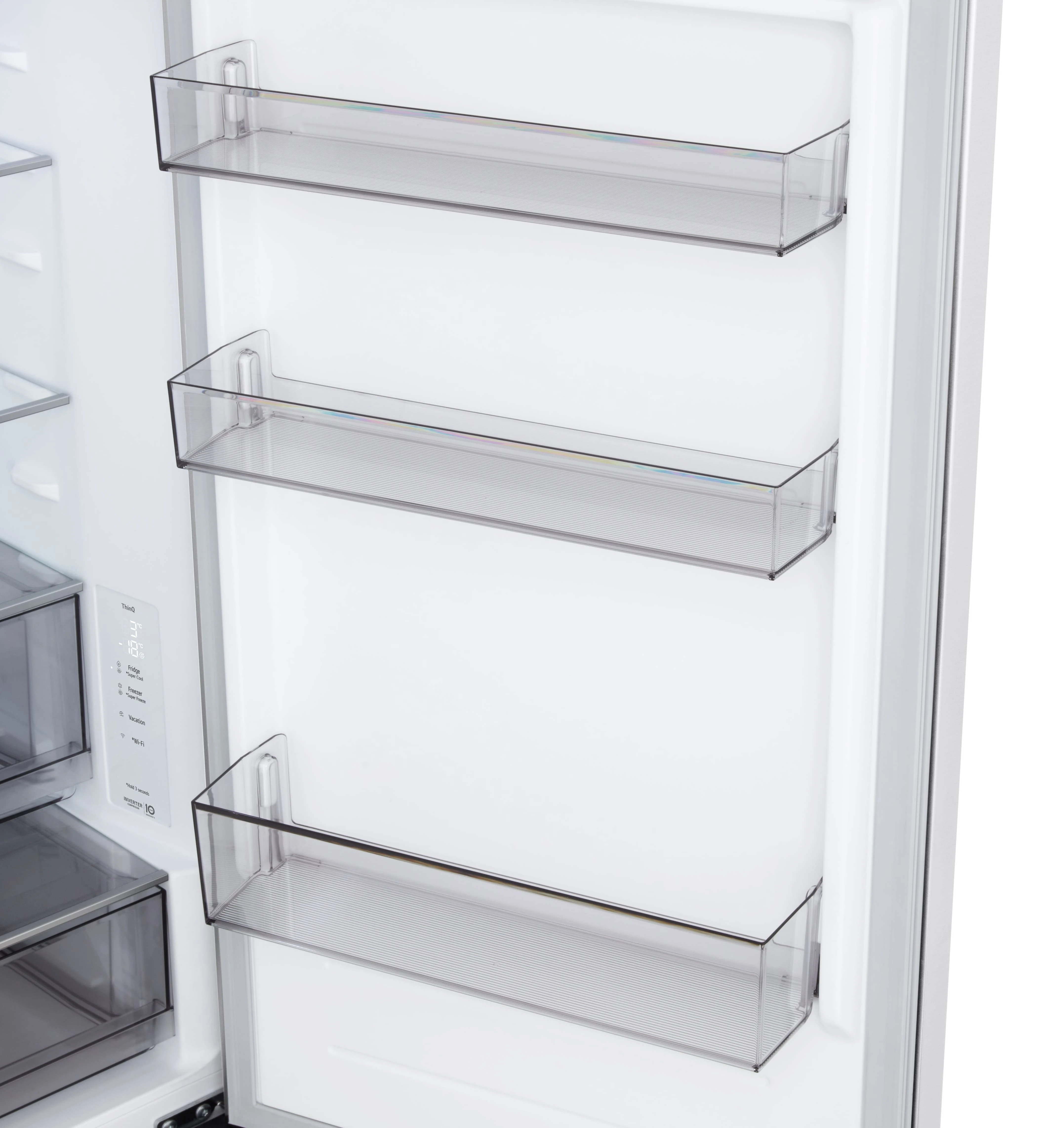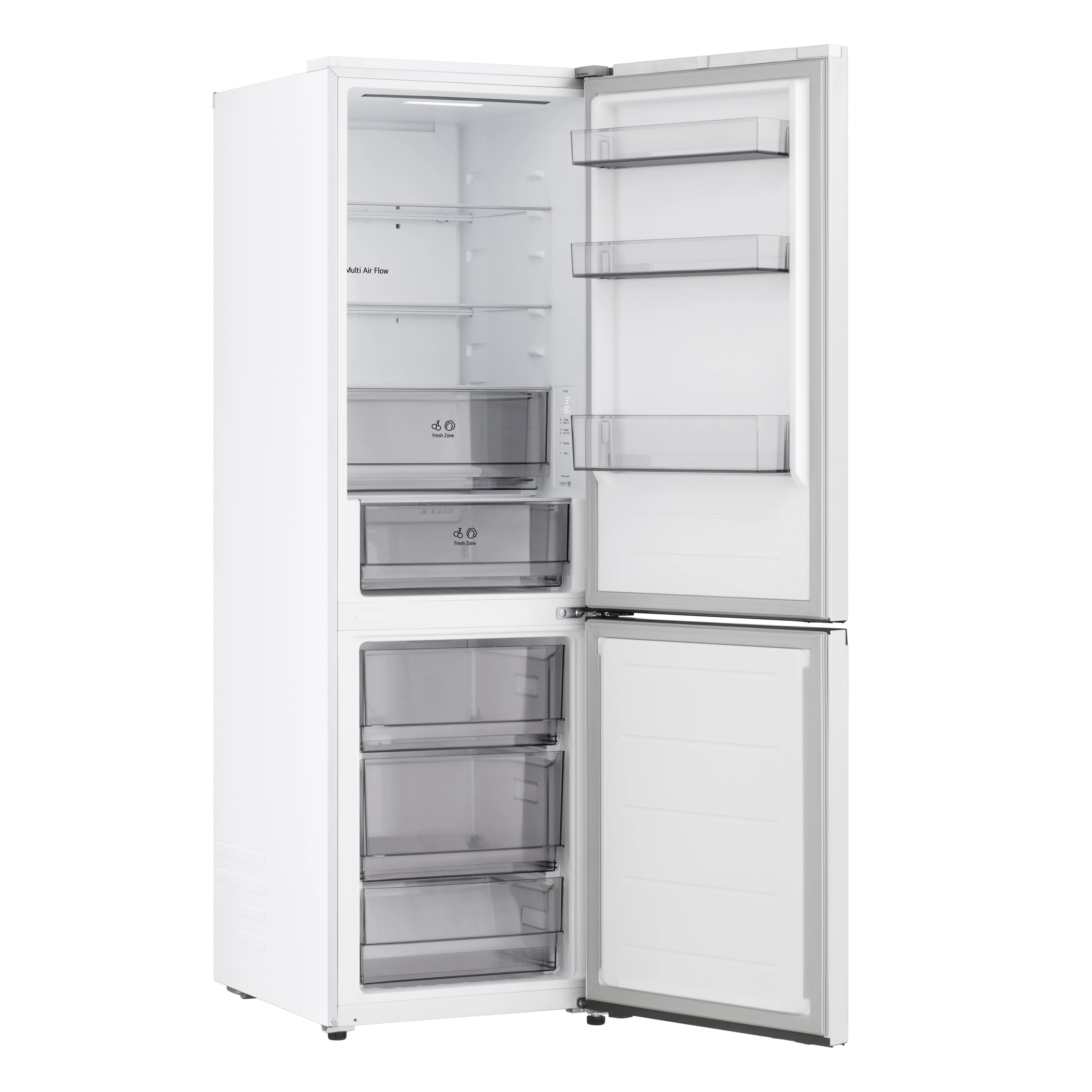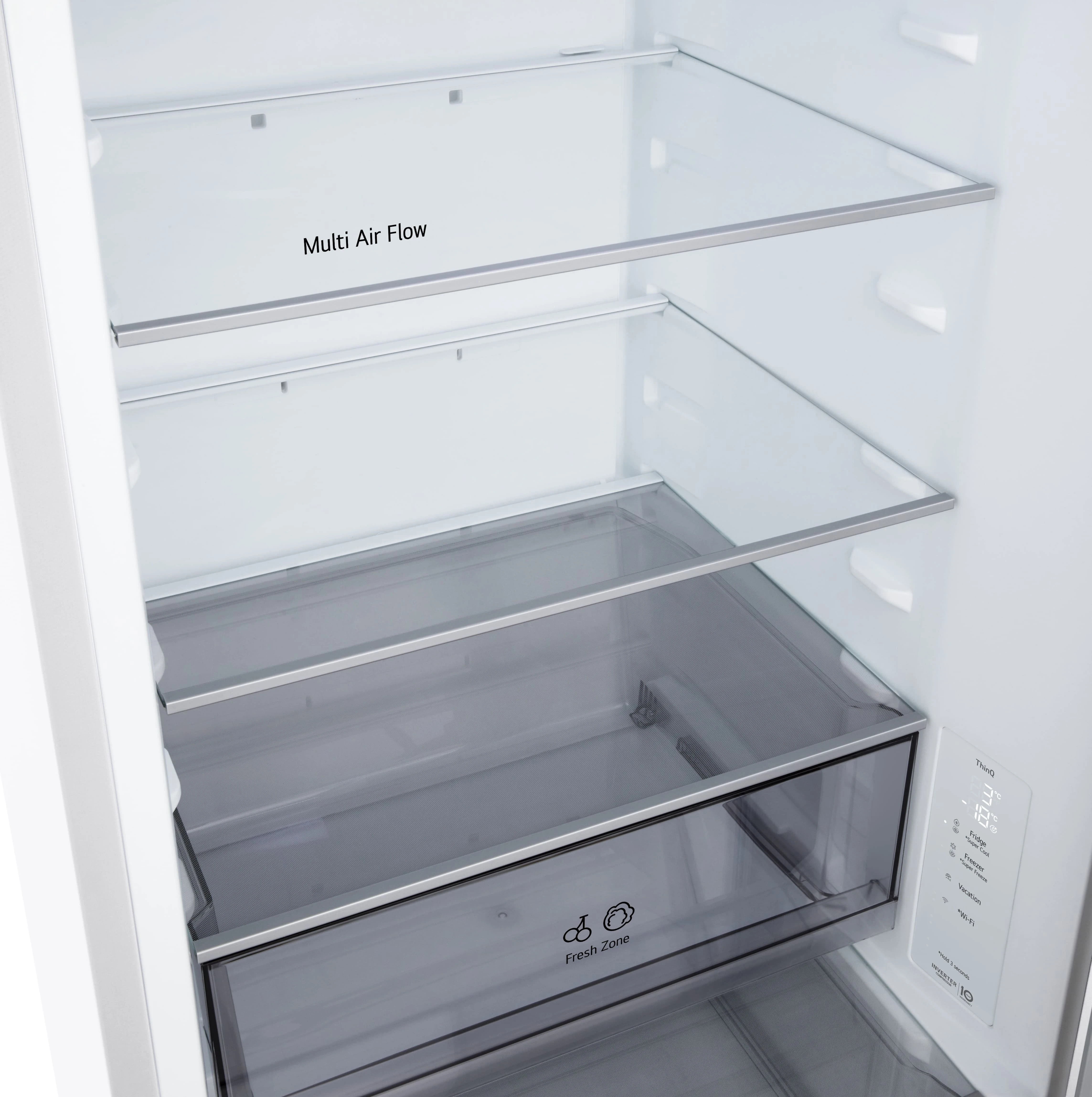 Холодильник LG GC-B459EQYM з нижньою морозильною камерою підтримує стабільну температуру завдяки інверторному компресору та системі Total No Frost. Загальний корисний об’єм — 333 літри: 220 літрів у холодильній камері та 113 літрів у морозильній. Технологія DoorCooling+ швидко відновлює холод після відкриття дверей, а зона свіжості Fresh Zone зберігає овочі та фрукти довше.