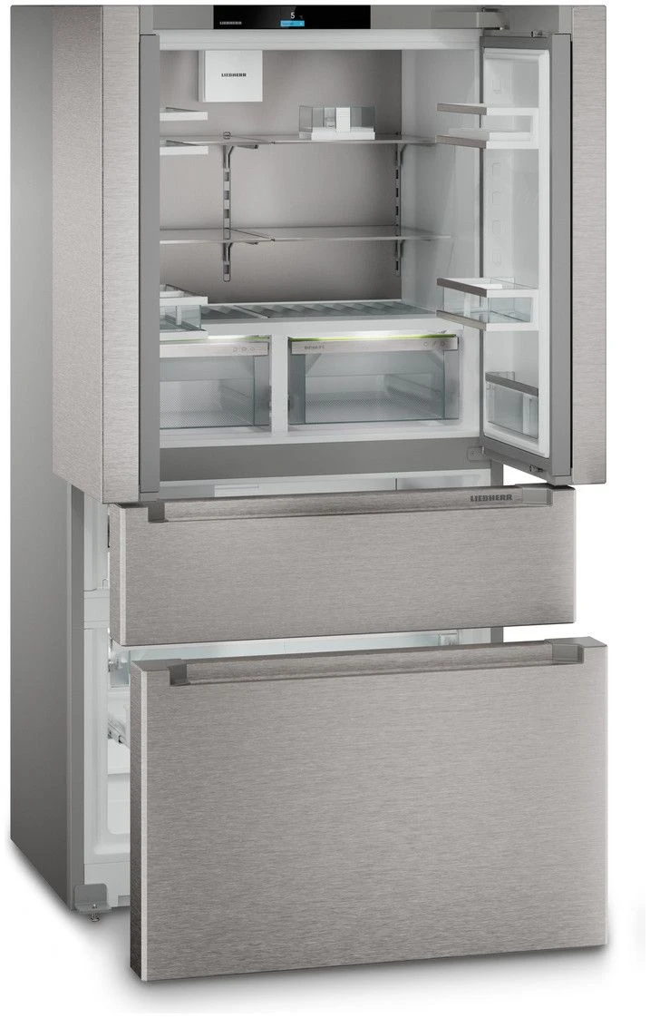 Liebherr MBsddi 9524 Plus — преміальний багатодверний холодильник French Door з корисним об'ємом 439 л і трьома незалежними температурними зонами. Технологія BioFresh зберігає свіжість продуктів до чотирьох разів довше завдяки підтриманню оптимальної вологості та температури в окремих контейнерах об'ємом 92 л. NoFrost і DuoCooling забезпечують роздільну циркуляцію повітря в холодильній і морозильній камерах — без інею та змішування запахів. Вбудований льодогенератор IceMaker виробляє до 0,8 кг льоду на добу, а корпус із нержавіючої сталі SmartSteel захищений від відбитків пальців.