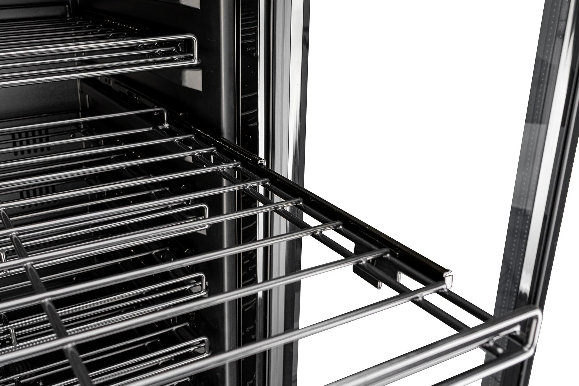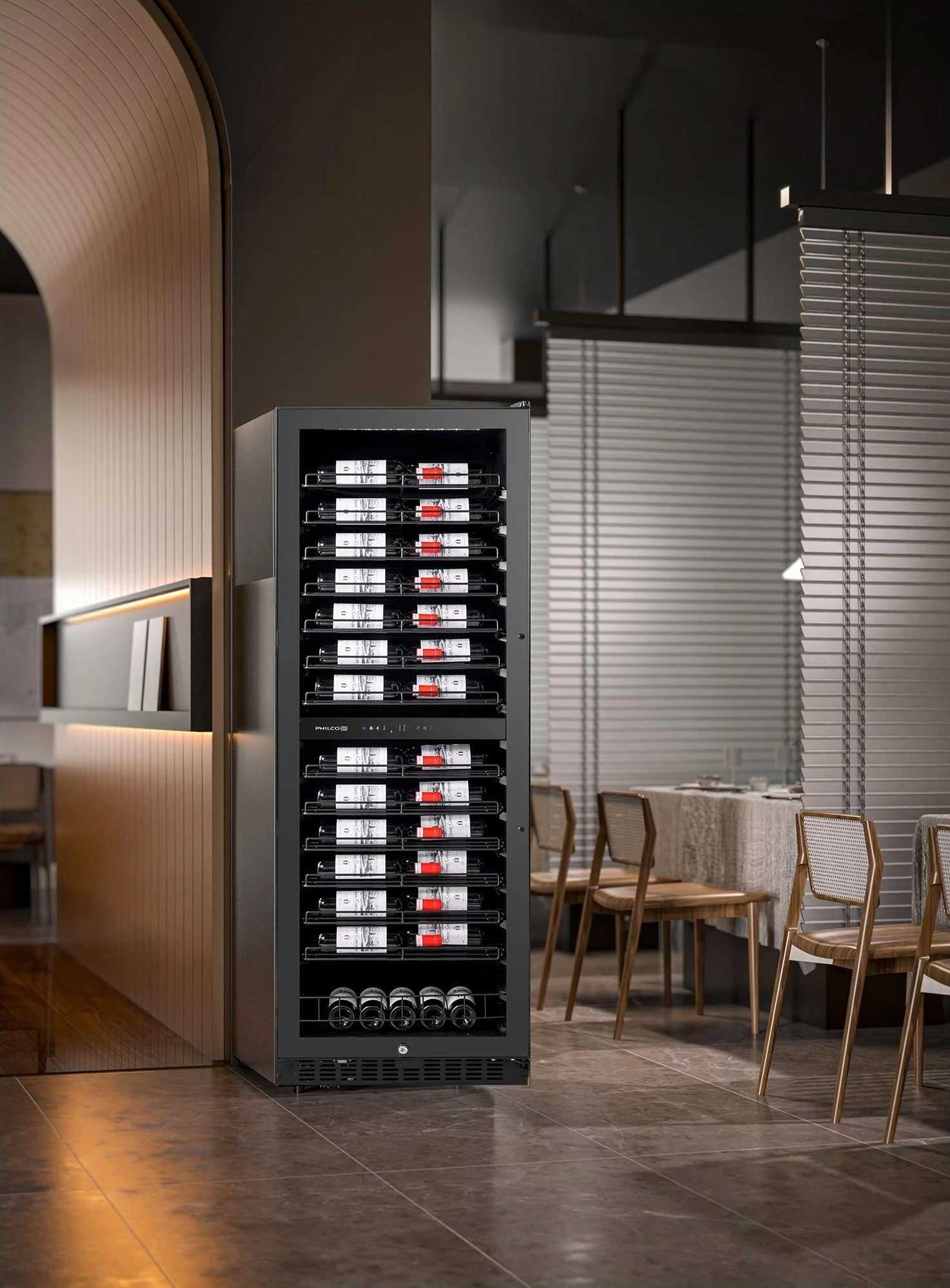Philco PW131GDC — преміальний двозонний винний холодильник на 131 пляшку (загальний об’єм 418 л) з окремим сенсорним керуванням для верхньої (5–20 °C) та нижньої (11–20 °C) зон. Чорний корпус, подвійне скло з УФ-фільтром, світлодіодне підсвічування, полиці LabelView, антивібраційний компресор, вугільний фільтр і захист WinterCare (працює навіть при +5 °C). Ідеальне рішення для домашнього винного погребу чи ресторану.