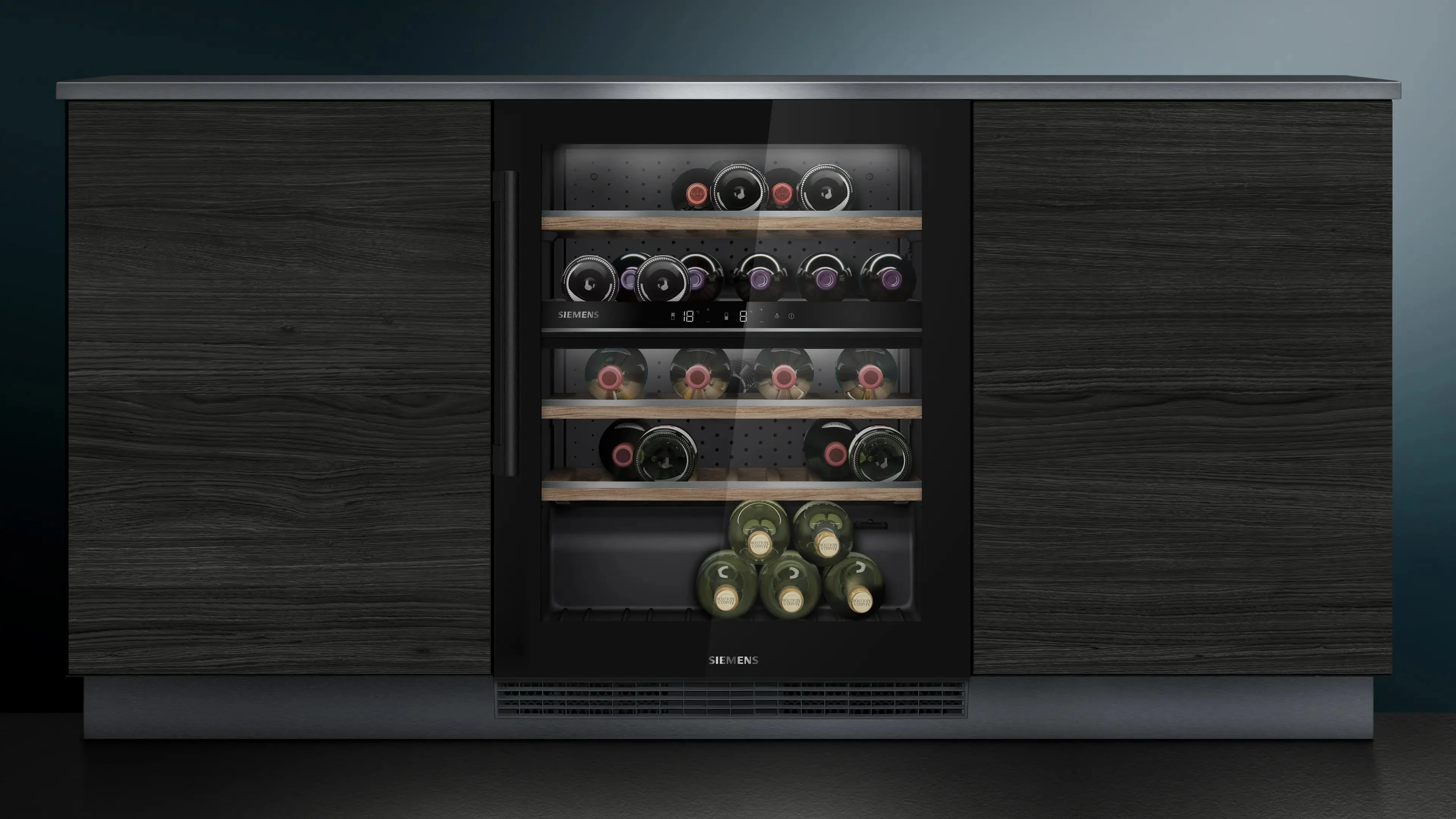 Холодильник для вина Siemens призначений для зберігання вин у двох незалежних температурних зонах. Модель оснащена дубовими полицями з металевими елементами, скляними дверцятами з UV-захистом і світлодіодним освітленням з режимом презентації. Передбачене зберігання до 44 пляшок. Кожну температурну зону можна налаштувати в діапазоні від 5 °C до 20 °C.