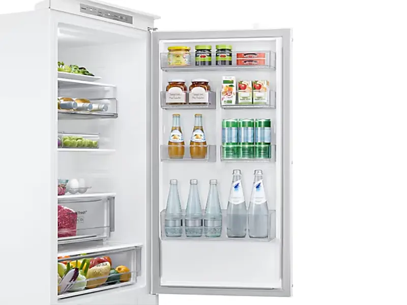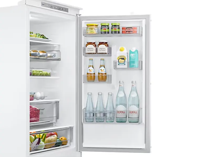 Підтримуйте оптимальну температуру всередині холодильника, щоб продукти залишалися свіжими, навіть якщо ви часто відчиняєте та зачиняєте дверцята. Металева охолоджувальна панель, металева поліця та плоский металевий повітропровід утримують холод із повітря та допомагають відновити втрату тепла. Вони стильно виглядають та прості у чищенні.