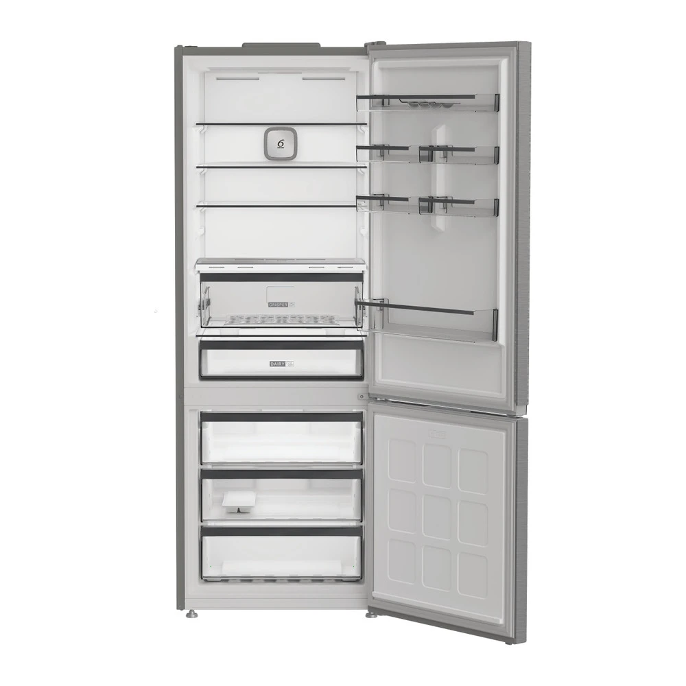 Холодильник Whirlpool WHK2 6493 X5E — модель із нижньою морозильною камерою та загальним корисним об’ємом 490 л. Система Dual No Frost працює в обох відділеннях і зменшує потребу в розморожуванні. Електронне керування із зовнішнім дисплеєм спрощує налаштування температури та режимів. Інверторний компресор підтримує стабільну роботу з рівнем шуму 35 дБ. Внутрішній простір доповнений окремими зонами для зберігання продуктів різних типів.
