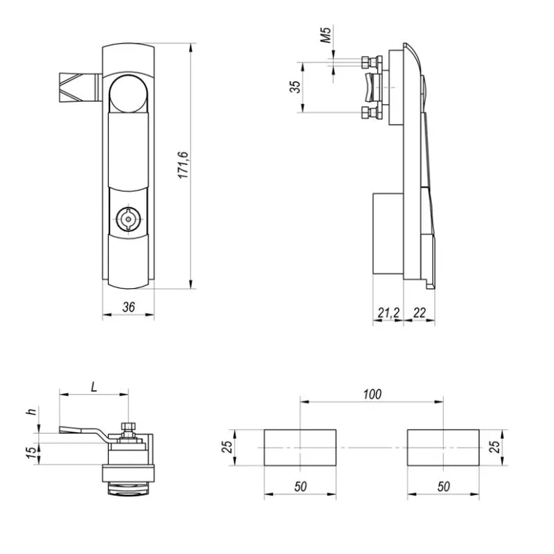 Замок сумісний із металевими корпусами мережевих шаф, блоками розподілу живлення та кріпильними елементами стандартного типу. Його можна використовувати разом із тягами для трьохточкових систем, ущільнювачами дверей і монтажними планками. Відповідає стандартним отворам 50×25 мм із міжцентровою відстанню 100 мм.