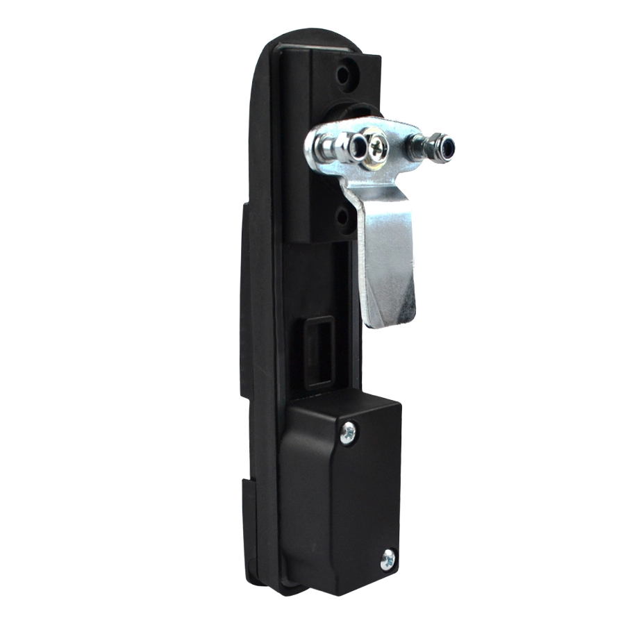 Замок для мережевих шаф RZ DB 007-2-02 — це міцний механізм із поворотною ручкою, призначений для металевих корпусів, телекомунікаційних і серверних шаф. Корпус і ручка виготовлені зі склонаповненого поліаміду, ригель — зі сталі. Три точки замикання забезпечують рівномірне притискання дверцят, що підвищує герметичність і безпечність експлуатації. Чорне покриття має антистатичні властивості й добре поєднується з обладнанням стандартного серверного кольору.