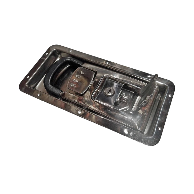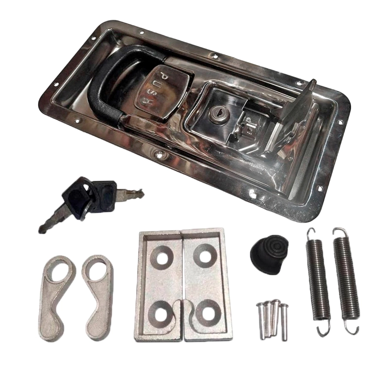 Замок для задніх воріт напівпричепа з нержавіючої сталі — це міцний ригельний механізм, який використовується для фіксації задніх дверей вантажних кузовів, контейнерів і напівпричепів. Виготовлений із високоякісної сталі, стійкої до корозії, з полірованою поверхнею, замок здатний витримувати вплив вологи, реагентів та механічні навантаження. Конструкція забезпечує щільне прилягання дверцят, запобігає мимовільному відкриванню під час руху й гарантує тривалий термін служби навіть у складних умовах експлуатації.