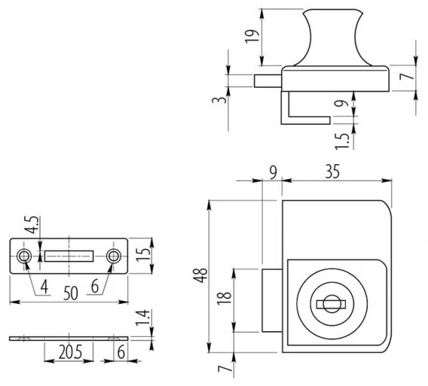 - Габарити лицьової частини замка 35х48 мм