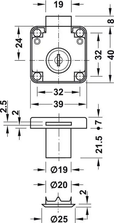 - Відстань від краю корпусу до центру квадрата ручки 19,5 мм