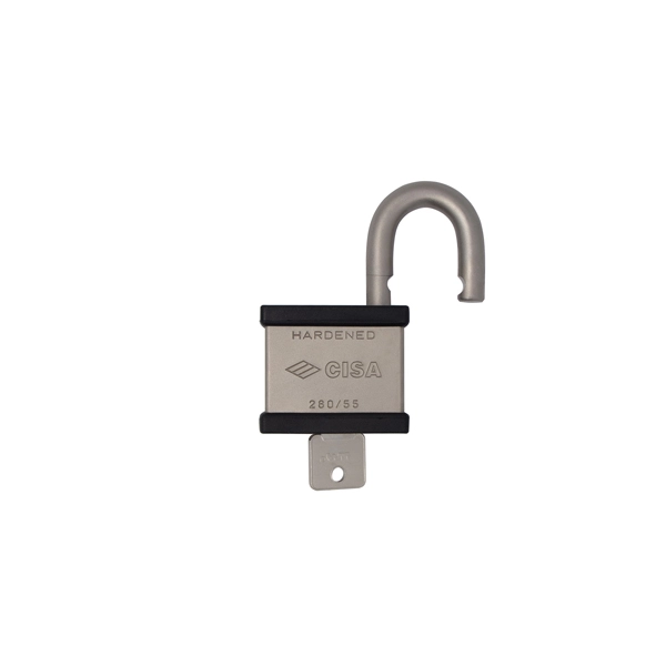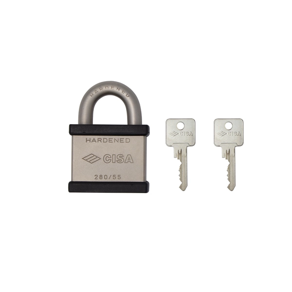 CISA 28050 – це дугоподібний навісний замок, який обирають насамперед для зовнішнього застосування. Обумовлено це тим, що корпус замка виготовлений із вуглецевої сталі з антикорозійним нікелевим покриттям. Міцна стальна дужка також захищена хімічним нікелюванням. Це створює високу надійність та стійкість до атмосферних впливів.