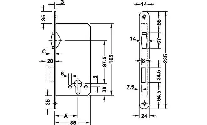 - Габарити лицьової частини замка 24х235 мм