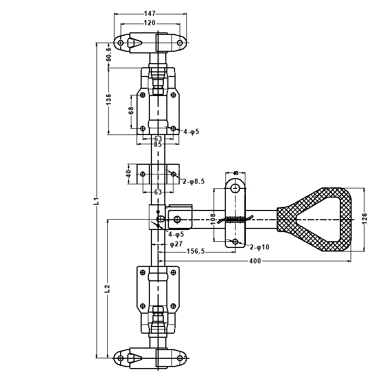 Запірний замок із цинковим покриттям призначений для дверей напівпричепів, фургонів і контейнерів. Він забезпечує надійну фіксацію та щільне прилягання дверей, запобігаючи їх випадковому відкриттю під час руху. Корпус виготовлений зі сталі з гальванічним покриттям, що захищає від корозії, механічних пошкоджень і впливу вологи. Конструкція сумісна зі штоками діаметром 27 мм — стандартом для більшості транспортних систем.
