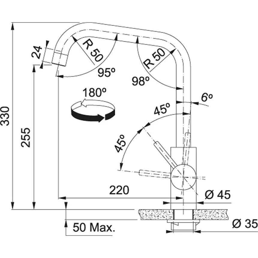 - Кут повороту зливу 180