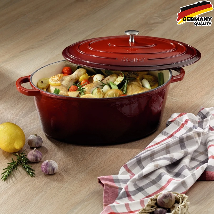 Ексклюзивна чавунна гусятница з кришкою Kela Calido , володіє особливим дизайном - червоне глянсове покриття зовні та емаль бежевого кольору всередині. Переваги цієї чавунної жаровні - дуже гарне акумулювання тепла. Гусятница підходить як для обсмажування (до 300 ° C), так і для тривалого тушкування м'яса у власному соку. З посудом серії Calido, не тільки кухонне начиння стає привабливим, але і результати приготування та смаження.