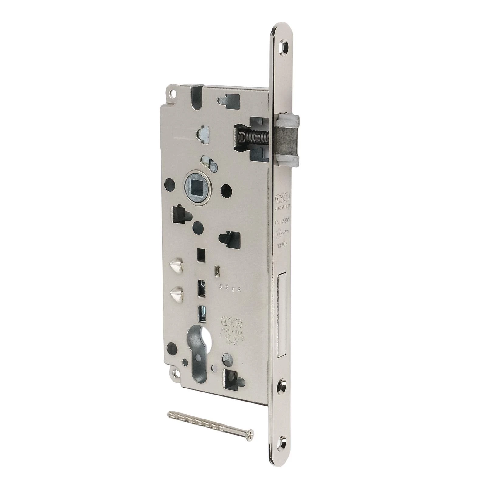 AGB Sicurezza B00851.50.06 — усиленный врезной замок под евроцилиндр формата PZ, предназначенный для межкомнатных и служебных дверей с высокой эксплуатационной нагрузкой. Торцевая планка имеет ширину 22 мм, межосевое расстояние составляет 85 мм, а backset (отступ) — 50 мм. Корпус изготовлен из стали, лицевая планка покрыта блестящим никелем, что обеспечивает эстетичный вид и стойкость к износу. Механизм рассчитан на длительную интенсивную эксплуатацию.
