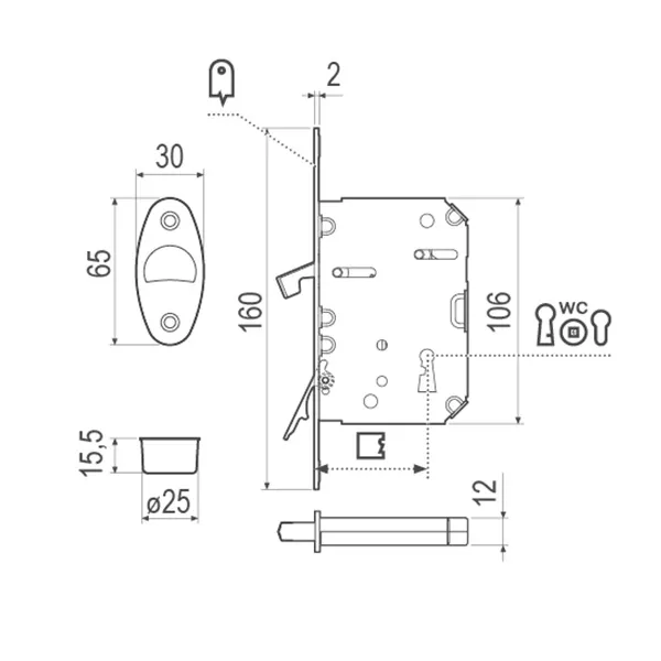 Замок имеет оптимальную глубину корпуса 66 мм, что позволяет установку в стандартные дверные полотна. Диаметр монтажного отверстия 25 мм обеспечивает надежную фиксацию без ослабления конструкции двери. Расстояние от торца до центра ригелей 50 мм соответствует стандартным требованиям для раздвижных систем.