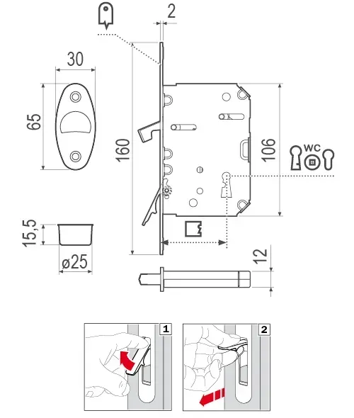 - Диаметр монтажного отверстия под корпус замка 25 мм