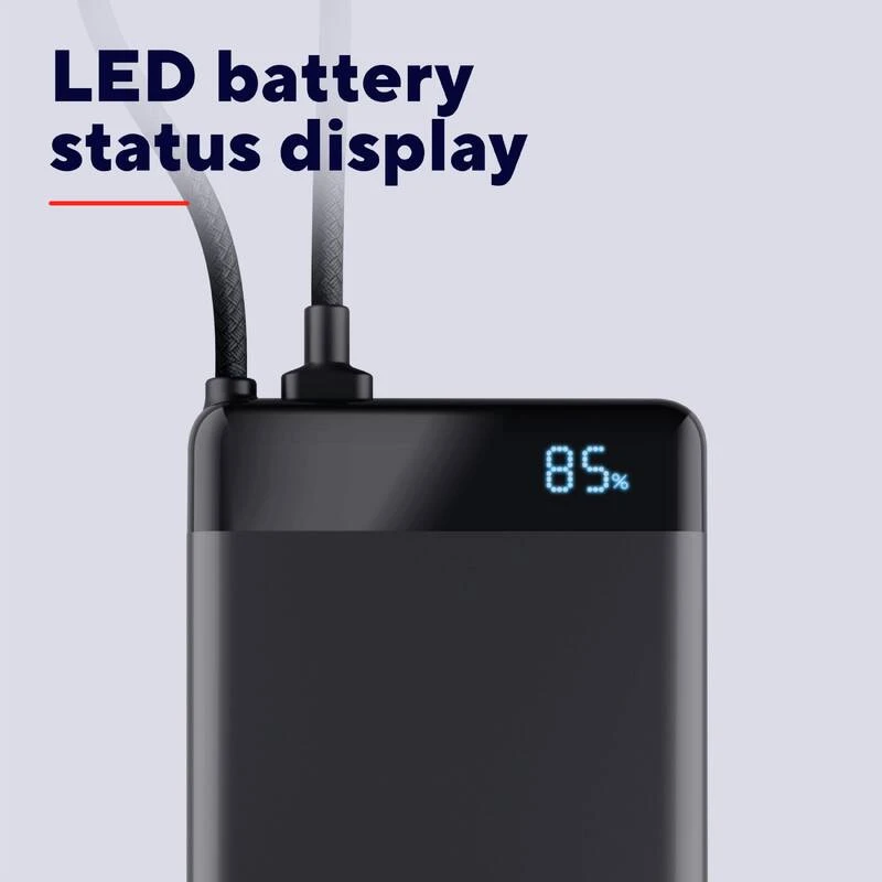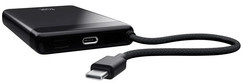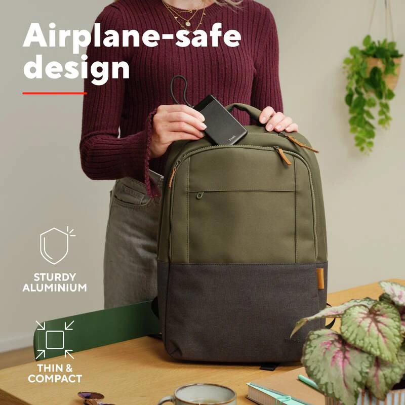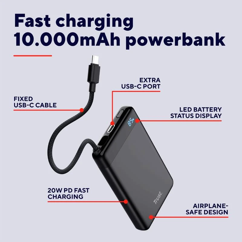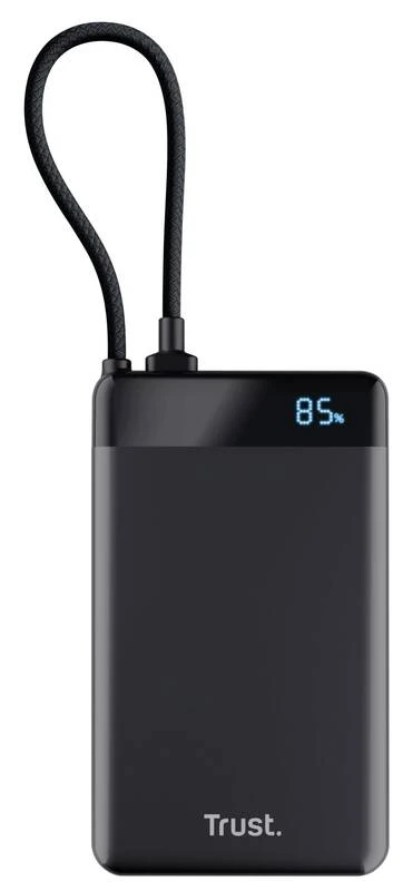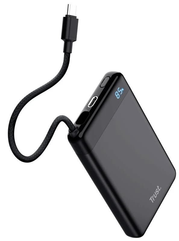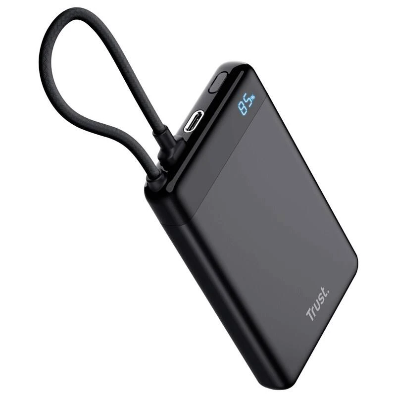 Trust Fiera 10000 мА·год (25880) — компактний та стильний павербанк з вбудованим кабелем USB-C, що забезпечує швидке заряджання до 20 Вт (PD 3.0 + QC 3.0). Має ємність 10000 мА·год, два порти USB-C (один для зарядки самого павербанка та пристроїв, другий тільки вихід), світлодіодний дисплей з точним відсотком заряду (0–100 %) та індикацією PD-режиму. Корпус алюмінієвий чорний, товщина ≈15–18 мм, вага ≈200 г — зручно носити в кишені. Дозволяє заряджати смартфон від 0 до 50 % приблизно за 30 хвилин, а сам павербанк повністю заряджається за 3–4 години. Безпечний для ручної поклажі в літаку, відповідає нормам авіакомпаній (≤100 Вт·год).