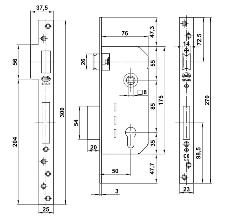 - Габариты лицевой части замка 23х270 мм