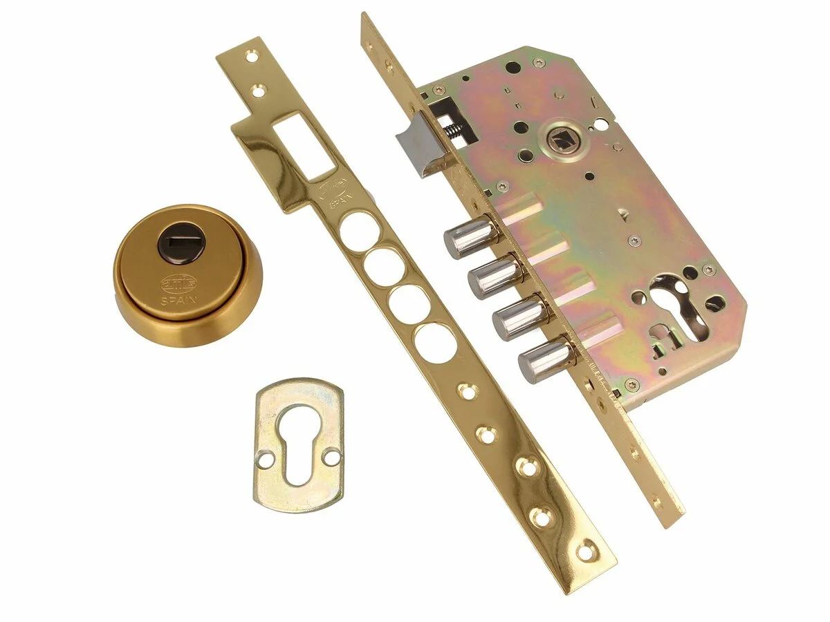 Замок AMIG мод.110 – 50/85 с четырьмя ригелями и броненакладкой м.31/33 в латунном исполнении — это надёжный механизм повышенной безопасности для металлических и бронедверей. Корпус выполнен из закалённой стали с декоративным латунным покрытием, устойчивым к коррозии и износу. Четыре массивных ригеля одновременно выдвигаются при повороте ключа, обеспечивая плотное и равномерное запирание. В комплект входят цилиндр, броненакладка и крепёж — установка возможна без дополнительных деталей.