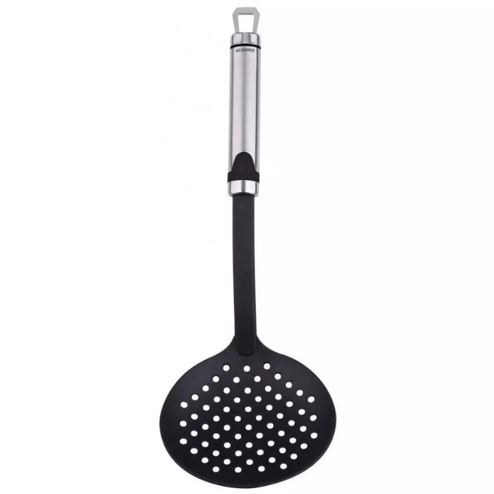 Особливості: зручно використовувати для перемішування продуктів та накладання готової страви; має прорізи, через які стікають надлишки олії, соусу або рідини; не залишає подряпин на посуді з антипригарним покриттям; зручний отвір для підвішування; можна мити в посудомийній машині.