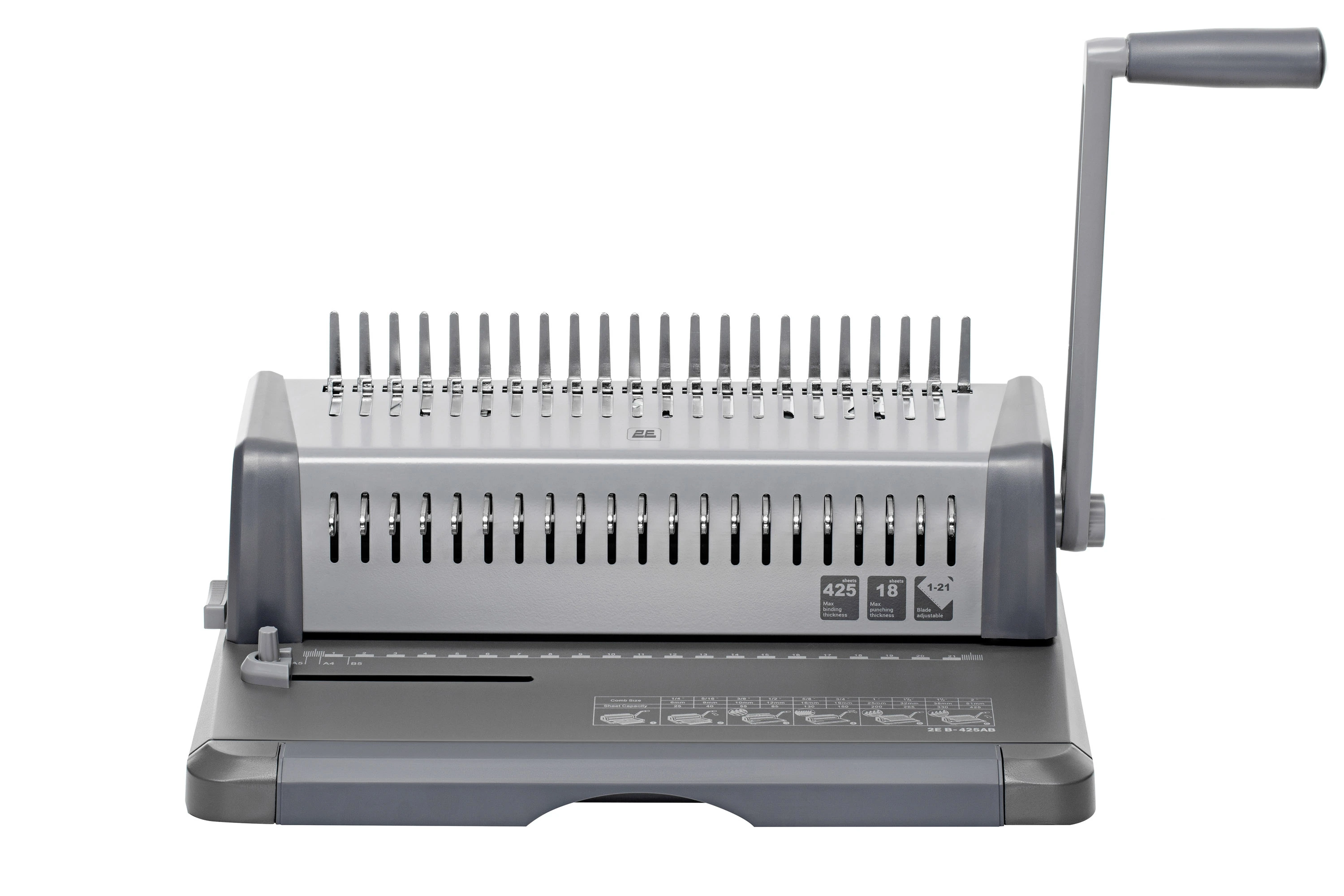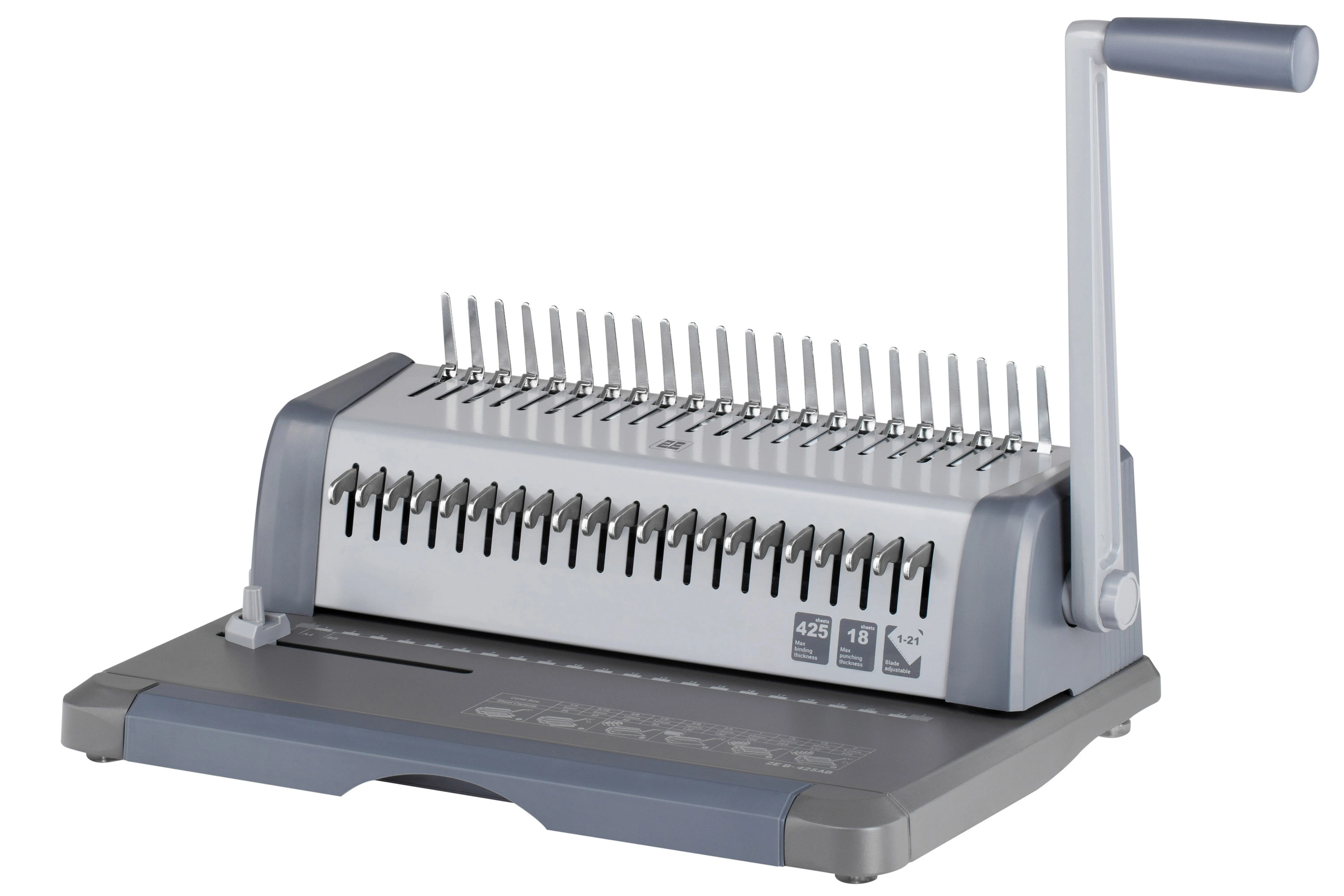 B-425AB – пристрій для перфорації та палітурки документації пластиковими пружинами діаметром 6 – 51 мм. За один раз біндер перфорує 18 аркушів стандартної щільності 80 г/м2, при цьому не потрібно докладати особливих зусиль. Працює за допомогою ножів (1 – 21), які вимикаються, забезпечуючи можливість працювати з різним форматами.