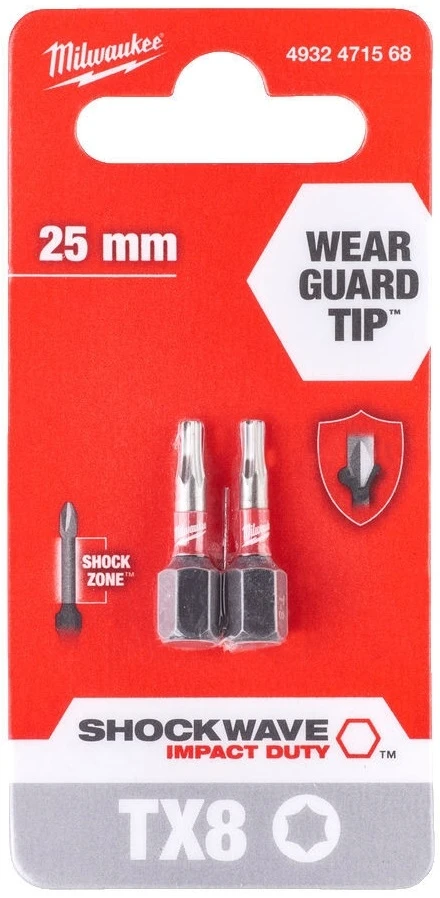 Набір біт Milwaukee Shockwave TX8 × 25 мм (4932471568) — 2 шт. для ударних інструментів, призначений для кріплення в гіпсокартонних конструкціях. Виготовлений зі сталі S2 з лазерним загартом наконечника Wear Guard Tip для стійкості до зносу та точного утримання. Зона Shockzone поглинає удари, зменшуючи ризик поломки, а шестигранна основа 1/4" забезпечує надійну фіксацію. Сумісний з шуруповертами Milwaukee для професійних робіт. Упаковка з 2 шт., вага 10 г.