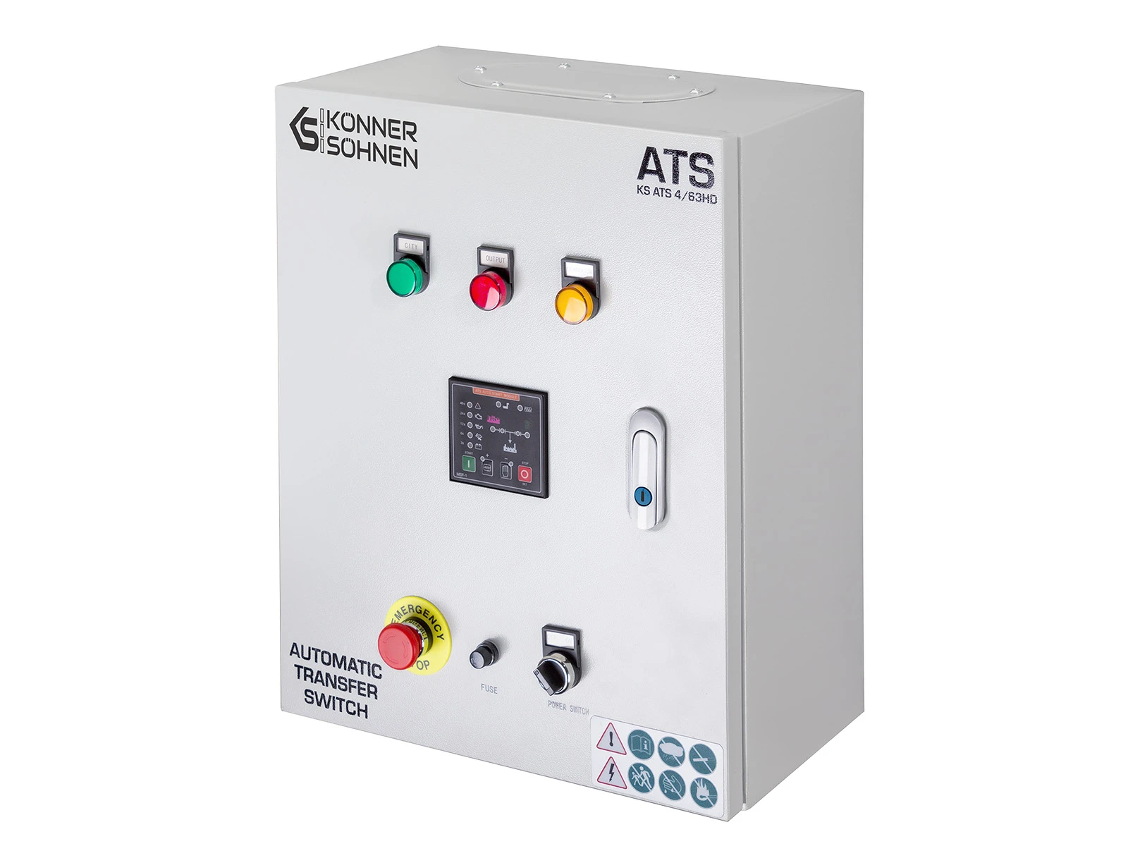 Блок автоматичного введення резерву (AВР) KS ATS 4/63HD німецької торгової марки Könner & Söhnen автоматично запускає генератор і перемикає навантаження на нього при відключенні основного джерела живлення, та автоматично зупиняє роботу генератора при відновленні центрального електропостачання.