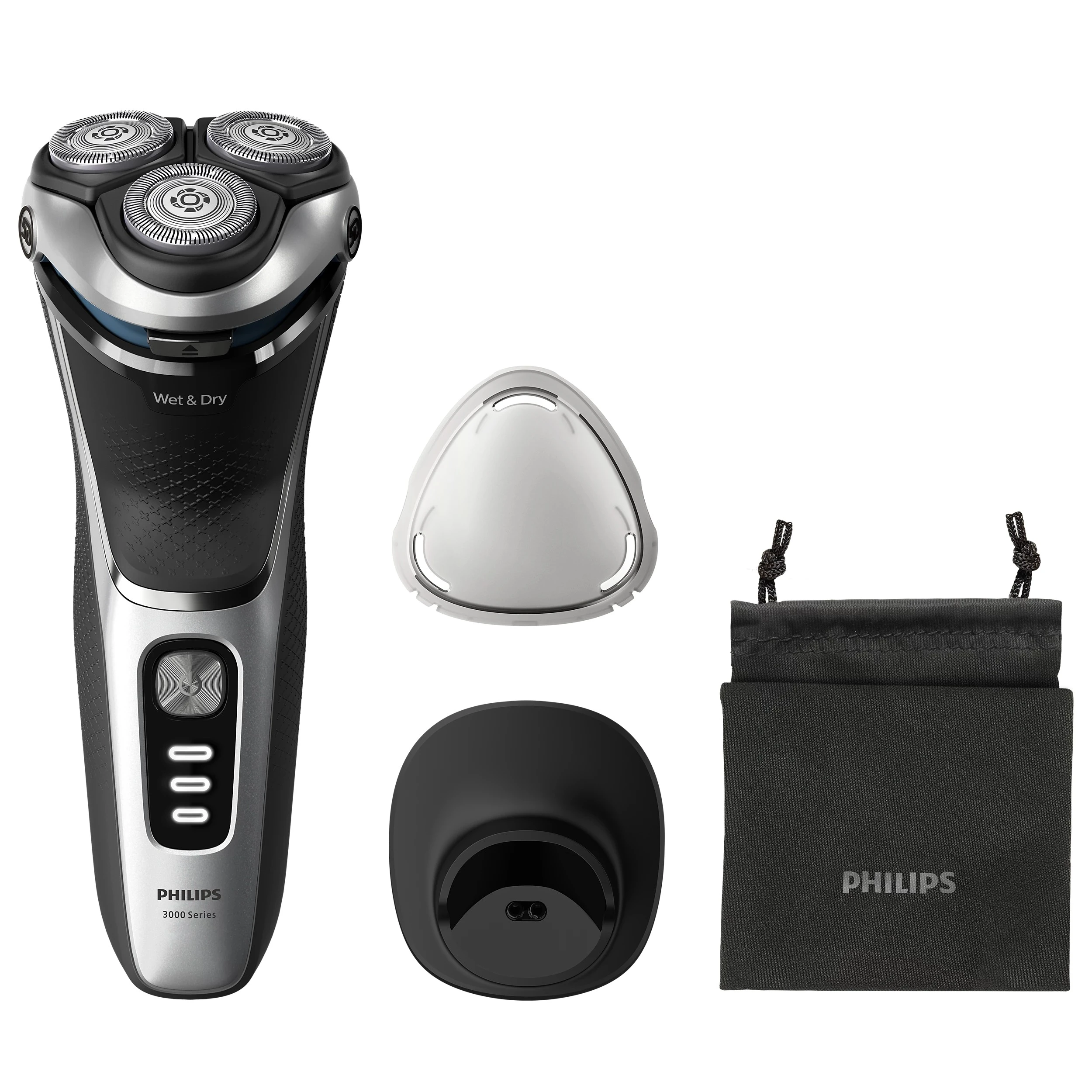 Електробритва для вологого та сухого гоління Philips серії 3000 з технологією SkinProtect забезпечує ретельне й комфортне гоління навіть чутливої шкіри. Головки 5D Pivot & Flex та 27 самозаточувальних лез PowerCut повторюють контури обличчя і голови та зрізають щетину трохи вище рівня шкіри. Леза з антикорозійним покриттям, до 60 хвилин автономної роботи після однієї години заряджання, вологе і сухе гоління з гелем чи пінкою, заряджання через USB А і зарядна підставка роблять цю бритву універсальним інструментом для щоденного догляду.