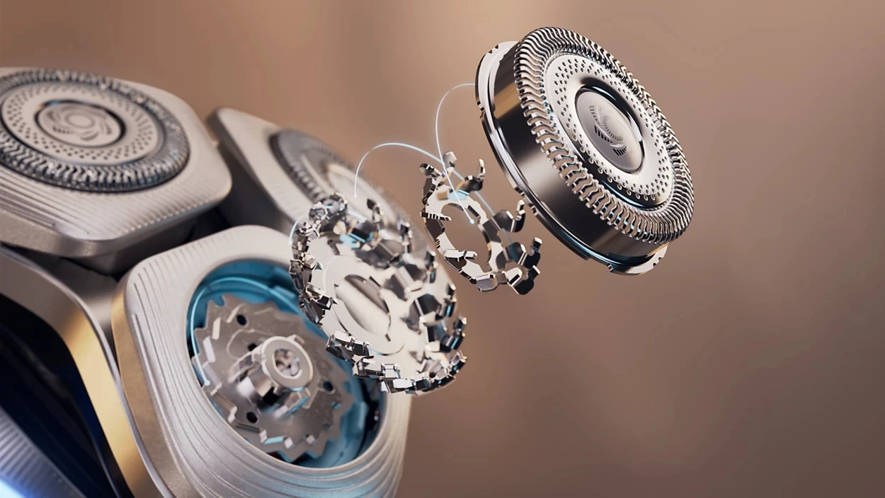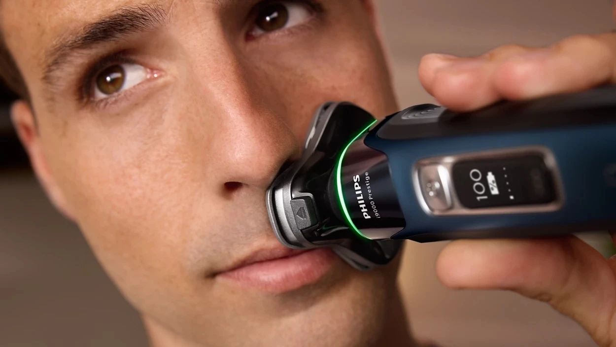 Електробритва Philips i9000 Prestige із системою гоління Lift&Cut потрійної дії й компактною головкою Precision Flexing, що вигинається на 360°, збриває волосся на рівні шкіри, навіть у місцях, які важко голити. Функція SkinIQ на базі штучного інтелекту визначає, спрямовує й адаптується для комфорту шкіри.