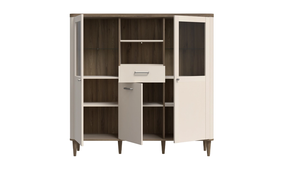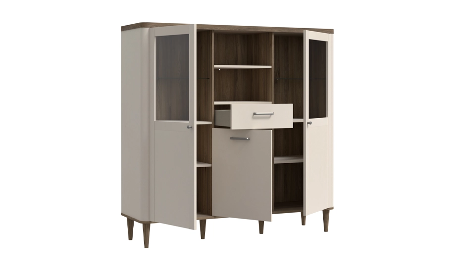Буфет 3д1ш Lacetti LCTV433 поєднує теплі відтінки дуба Валенсія з легкими бежевими фасадами, створюючи гармонійний акцент у сучасному інтер’єрі. Натуральні дерев’яні ніжки додають конструкції елегантності та стійкості, а металеві ручки підкреслюють сучасний стиль. Три відділення за дверцятами та містка шухляда забезпечують зручне зберігання, а скляні вставки на фасадах дозволяють красиво презентувати декор чи колекційні речі.