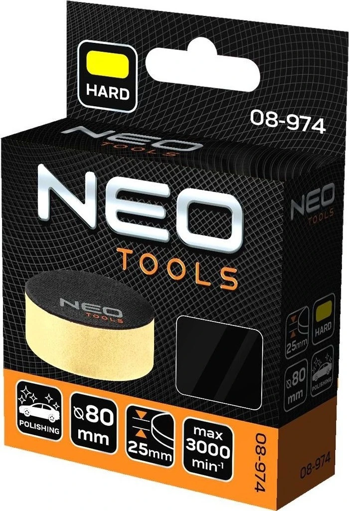 Полірувальна губка NEO (арт 08-974) діаметром 80 мм і товщиною губки 25 мм, кріпиться на липучці. Виготовлений з пінополіуретану. Призначена для використання з ротаційними і ексцентриково-ротаційними полірувальними машинами. Призначена для видалення більш глибоких подряпин і вм'ятин з лакофарбової поверхні, а також для підготовки поверхні до подальшої обробки. Рекомендується використовувати при максимальній частоті обертання 3 000 об/хв. Завдяки міцному поєднанню з тримачем на липучці (арт 08-977) виріб набуває більшої ефективності роботи.