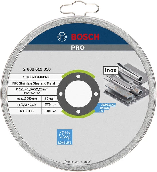 Відрізний диск Bosch Professional для нержавіючої сталі забезпечує стабільне різання та безпечну роботу. Структура з оксиду алюмінію та відсутність залізних, сірчаних і хлорованих домішок гарантують чистий різ на Inox. Отвір 22,23 мм призначений для стандартних кутових шліфувальних машин.