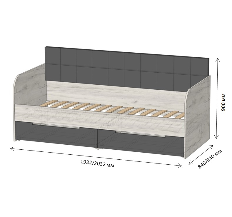 Кровать изготовлена из высококачественного ламинированного ДСП от Swiss Krono, что гарантирует долговечность конструкции и безопасность в использовании. Благодаря наличию ламелей, основание под матрас является ортопедическим, а два телескопических ящика подойдут для хранения игрушек, постельного белья или одежды.