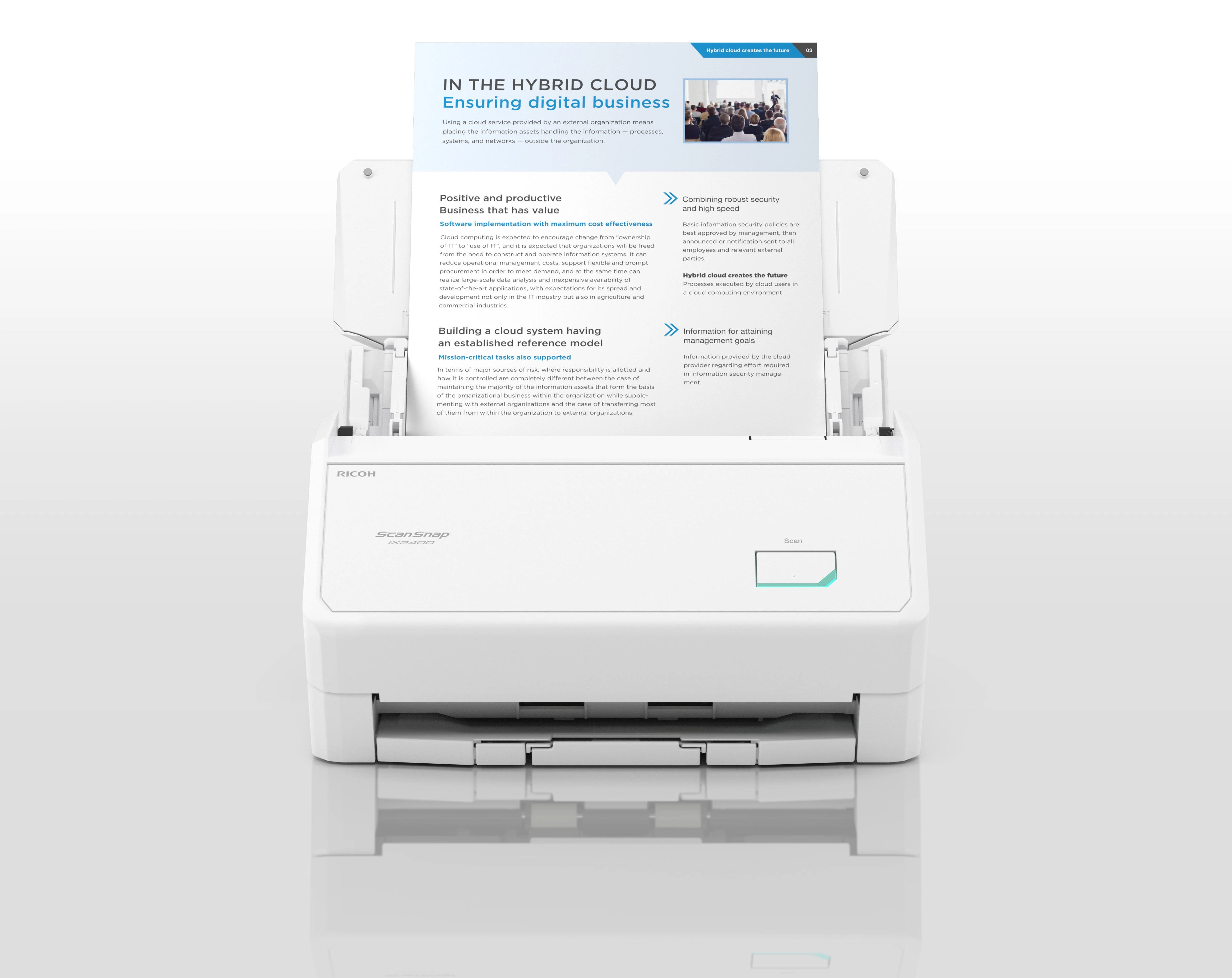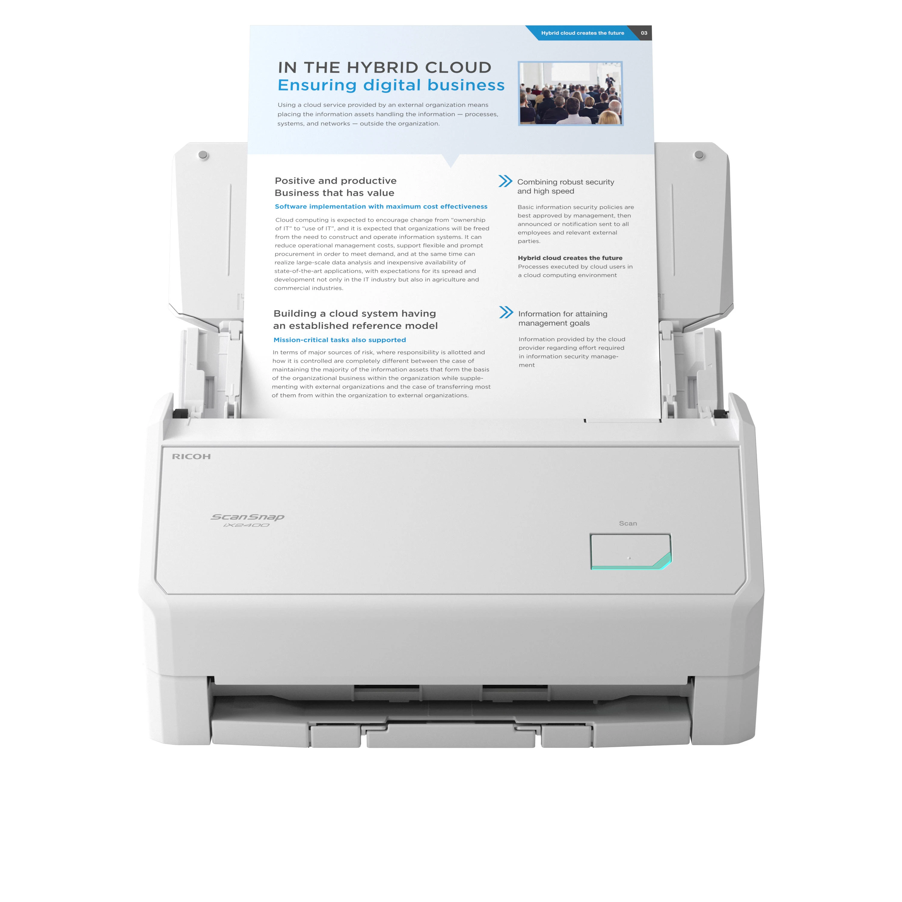 Настільний документ-сканер Ricoh ScanSnap iX2400 White забезпечує швидке двостороннє сканування формату А4 зі швидкістю 45 сторінок або 90 зображень за хвилину. Пристрій підключається виключно через USB 3.2 Type-C, що гарантує стабільну роботу без налаштування бездротових мереж. Автоматичний подавач на 100 аркушів і спеціальний Receipt Guide дозволяють надійно обробляти як стандартні документи, так і дрібні носії — чеки, візитки. Технологія Clear Image Capture забезпечує чітке зображення з мінімальними артефактами.