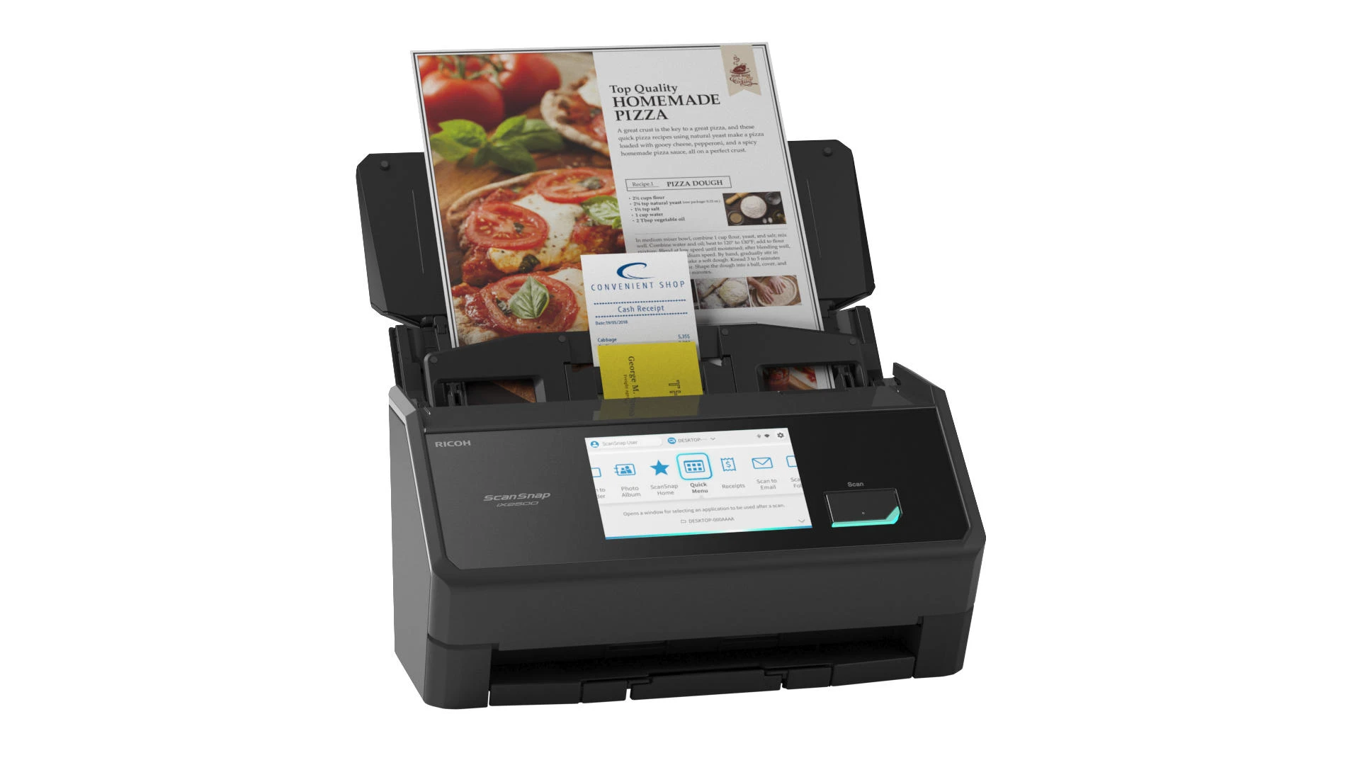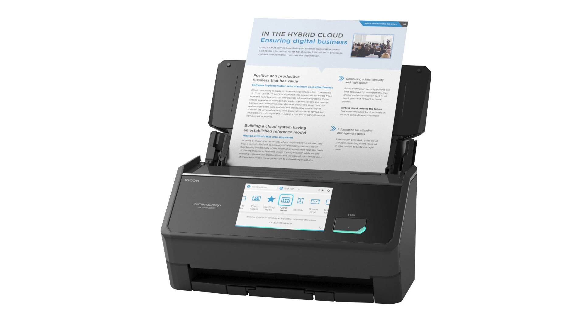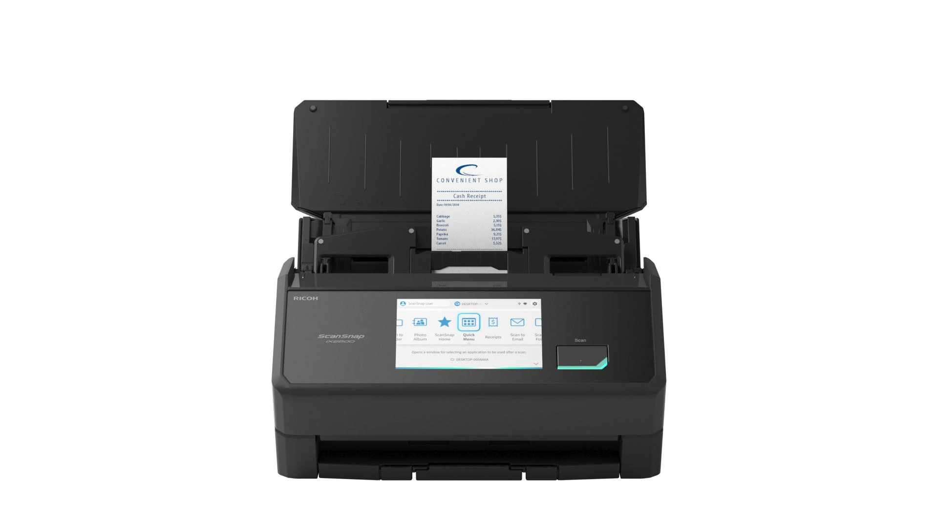 Ricoh ScanSnap iX2500 – настільний протяжний сканер формату A4 зі швидкістю до 45 сторінок за хвилину. Оснащений автоматичним подавачем документів із двостороннім скануванням. Сенсорний екран спрощує керування функціями. Підключення через Wi-Fi 6, USB 3.2 та Bluetooth 5.2 розширює варіанти інтеграції в робоче середовище.