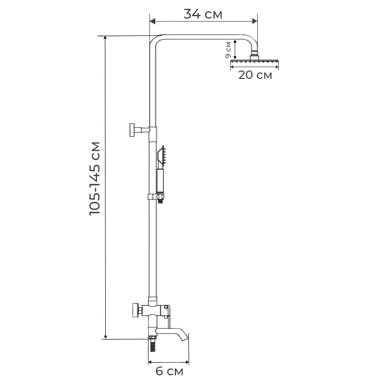 - Особенности Розміри ручної лійки: 20х8 см. Розміри стельової лійки: 20х20 см. Максимальна висота 145 см. Мінімал