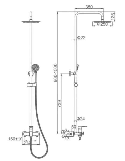 - Комплектация Шланг, ручна лійка 3 режими, стельова лійка 250мм, чашки, ексцентрики, гумові прокладки, тримач для