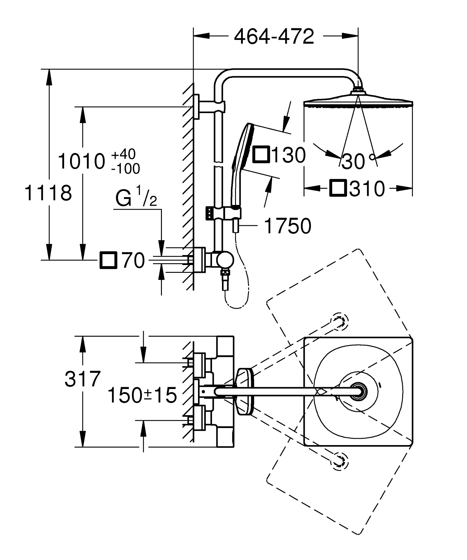 - Комплектация Душовий кронштейн 450 мм. Термостатичний змішувач. Душовий шланг Silverflex 1750 мм (28388000). Ручн