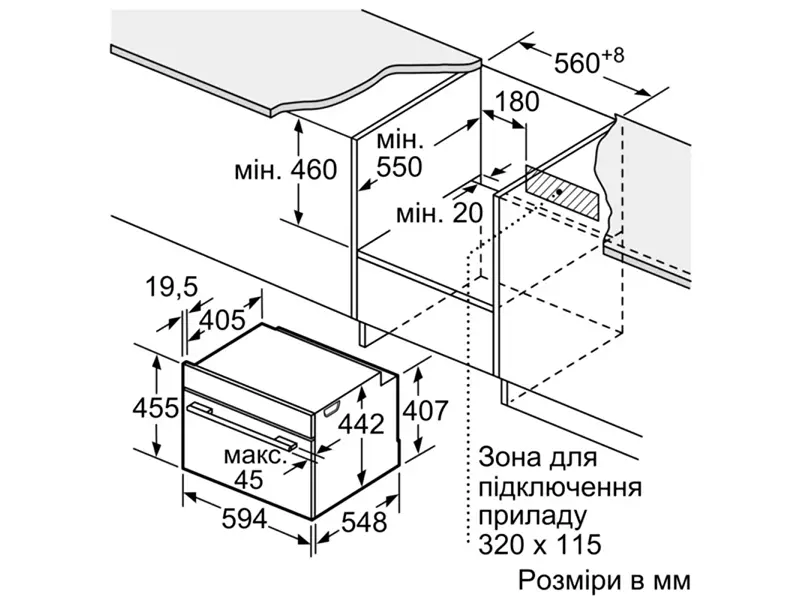 Размеры ниши (ВхШхГ): 450 мм – 455 мм x 560 мм – 568 мм x 550 мм