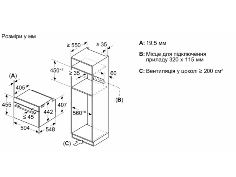 Размеры ниши (ВхШхГ): 450 мм – 455 мм x 560 мм – 568 мм x 550 мм